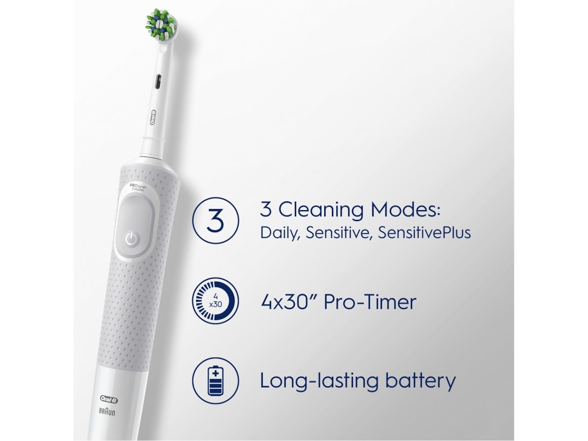 Tandbørsten har 3 børsteindstillinger: daglig rengøring, sensitiv og sensitiv plus for en utrolig nænsom oplevelse. En timer i håndtaget hjælper dig med at børste i de 2 minutter, der anbefales af tandlæger. Det bedste af det hele er, at den er fra Oral-B, det tandbørstemærke flest tandlæger i hele verden bruger.