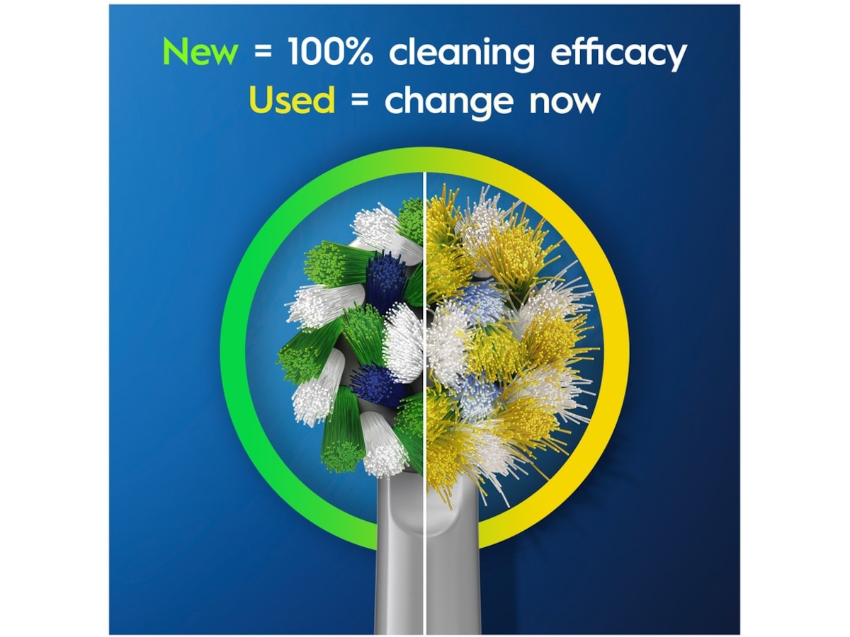 - Oral-B’s børstehoved falmer fra grønt til gult for at vise, hvornår det er tid til at skifte for at opretholde en 100 % rengøringseffektivitet