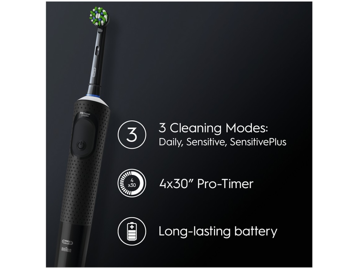 Tandbørsten har 3 børsteindstillinger: daglig rengøring, sensitiv og sensitiv plus for en utrolig nænsom oplevelse. En timer i håndtaget hjælper dig med at børste i de 2 minutter, der anbefales af tandlæger. Det bedste af det hele er, at den er fra Oral-B, det tandbørstemærke flest tandlæger i hele verden bruger.