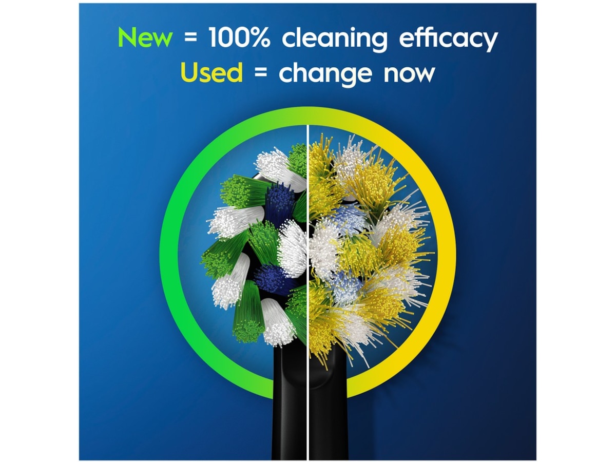 - Oral-B’s børstehoved falmer fra grønt til gult for at vise, hvornår det er tid til at skifte for at opretholde en 100 % rengøringseffektivitet