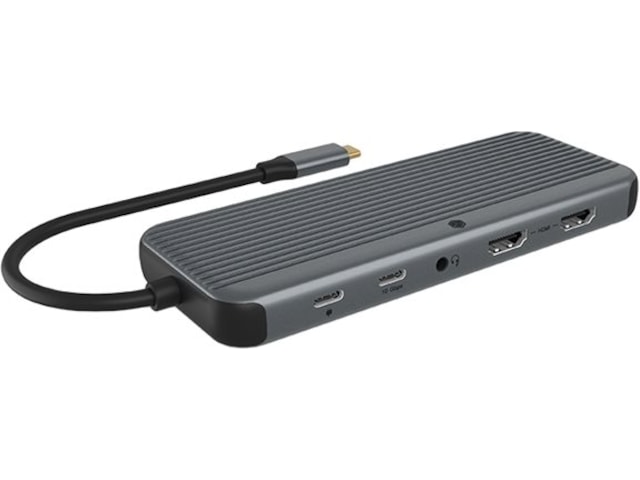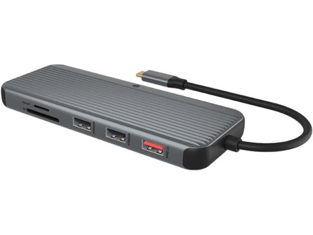 Den praktiske DockingStation håndterer ikke kun én skærm med 8K opløsning ved 30 Hz, men tre på én gang. Videoforbindelser foretages via to HDMI- og en DisplayPort-forbindelse. En forudsætning er, at værtscomputeren understøtter DisplayPort Alt-tilstanden.