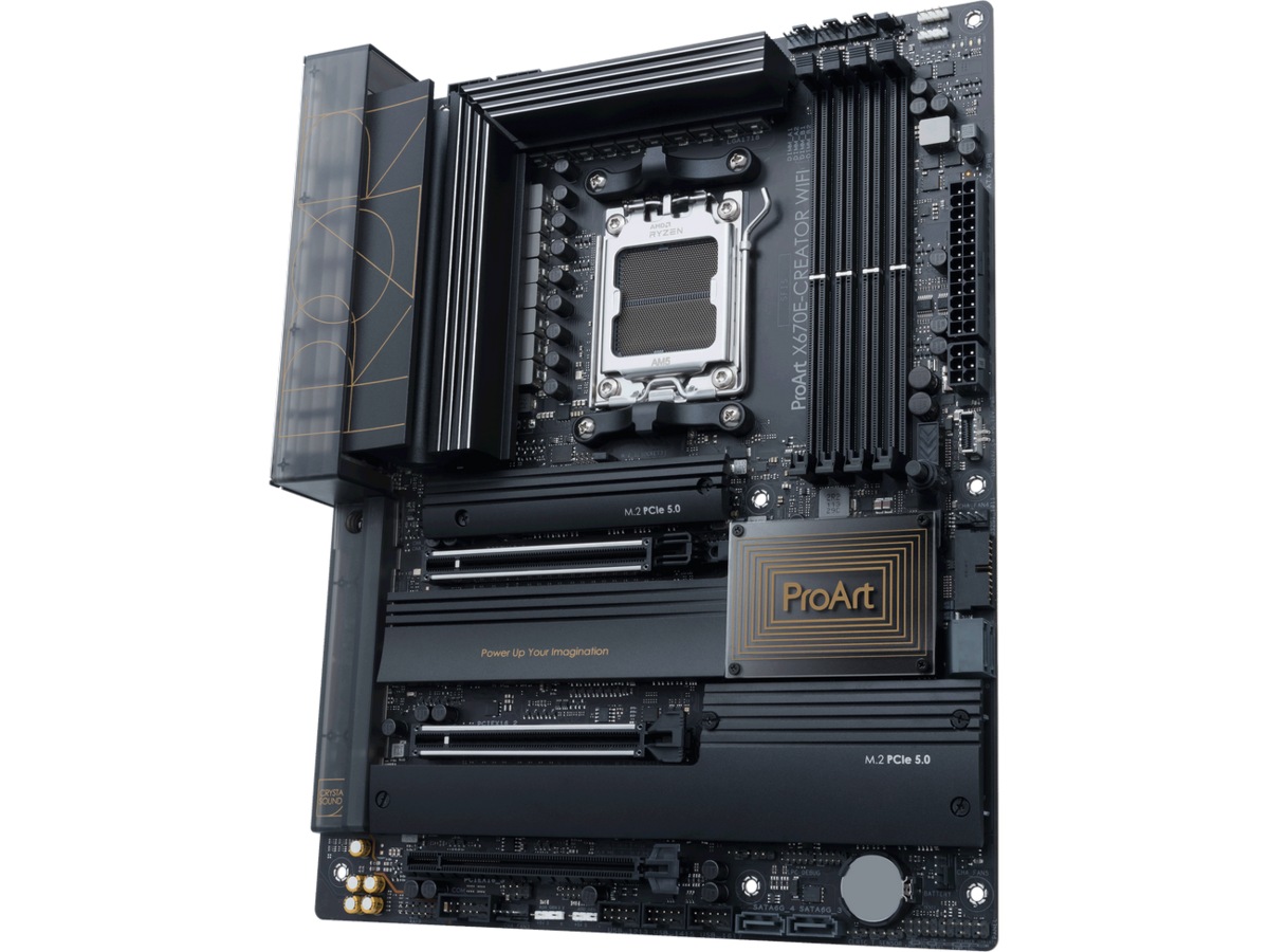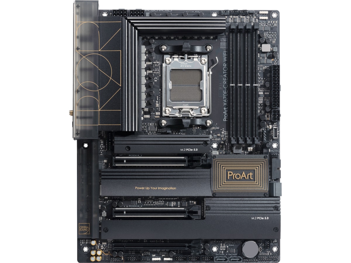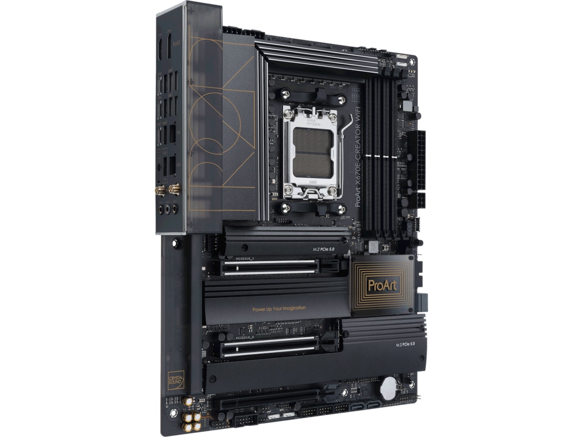 ProArt X670E-Creator WiFi styrker skabere på alle niveauer ved at maksimere ydeevnen af de nyeste AMD Ryzen™ 7000-seriens processorer med 16+2 teameffekttrin, DDR5 og PCIe 5.0 og lynhurtig tilslutning inklusive USB4®, 10 Gb og 2,5 Gb Ethernet, plus WiFi 6E.