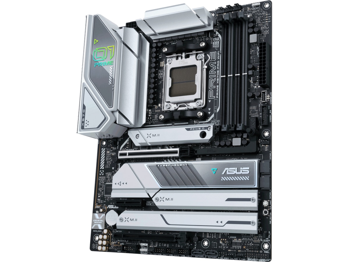 ASUS Prime-seriens bundkort er mesterligt udviklede til at frigøre det fulde potentiale i AMD Ryzen 7000-seriens processorer. PRIME X670E PRO WIFI har et robust strømdesign, omfattende køleløsninger og intelligente tuningmuligheder og giver brugere og PC-selvbyggere en række optimeringer af ydeevnen via intuitive software- og firmwarefunktioner. ASUS PRIME X670E-PRO WIFI tilbyder alt dette i en slank, futuristisk udseende enhed, der er centreret omkring et rumskibsdesign med et sølvfarvet navneskilt og chipsætdæksel.