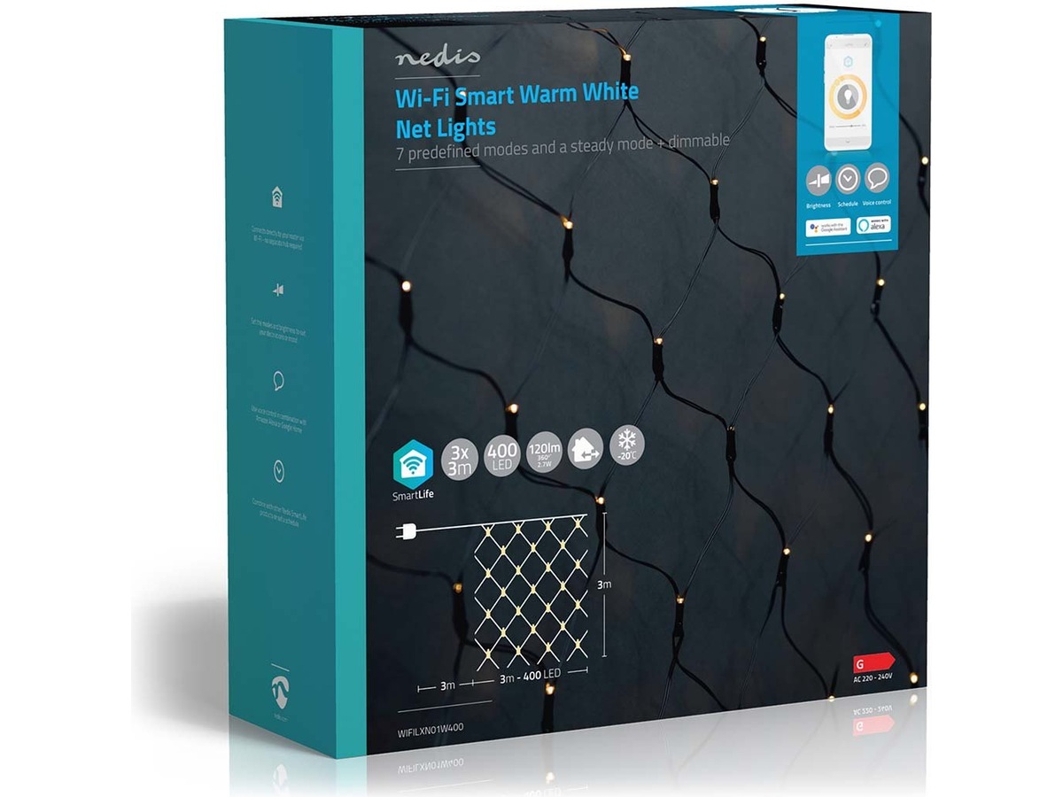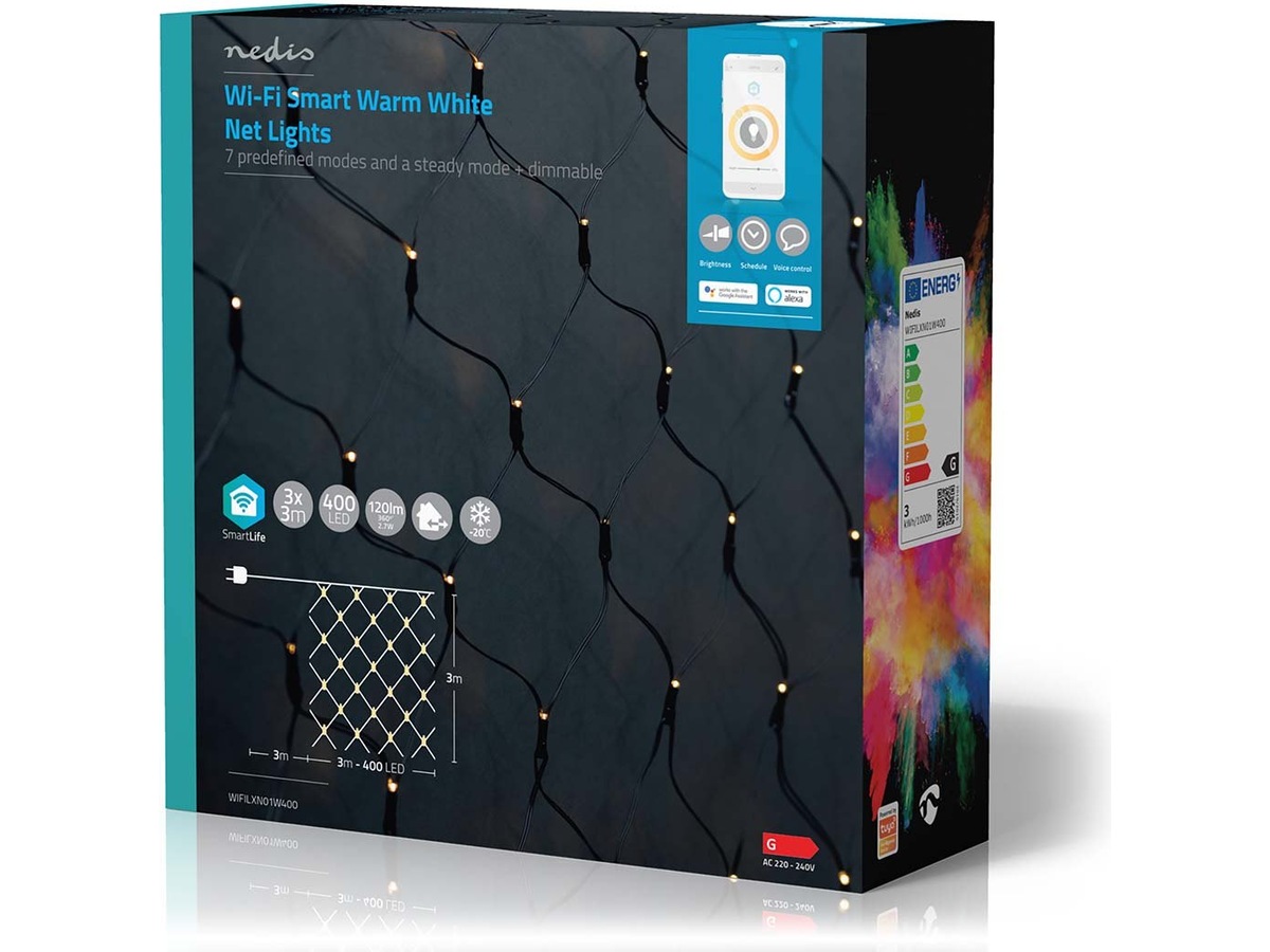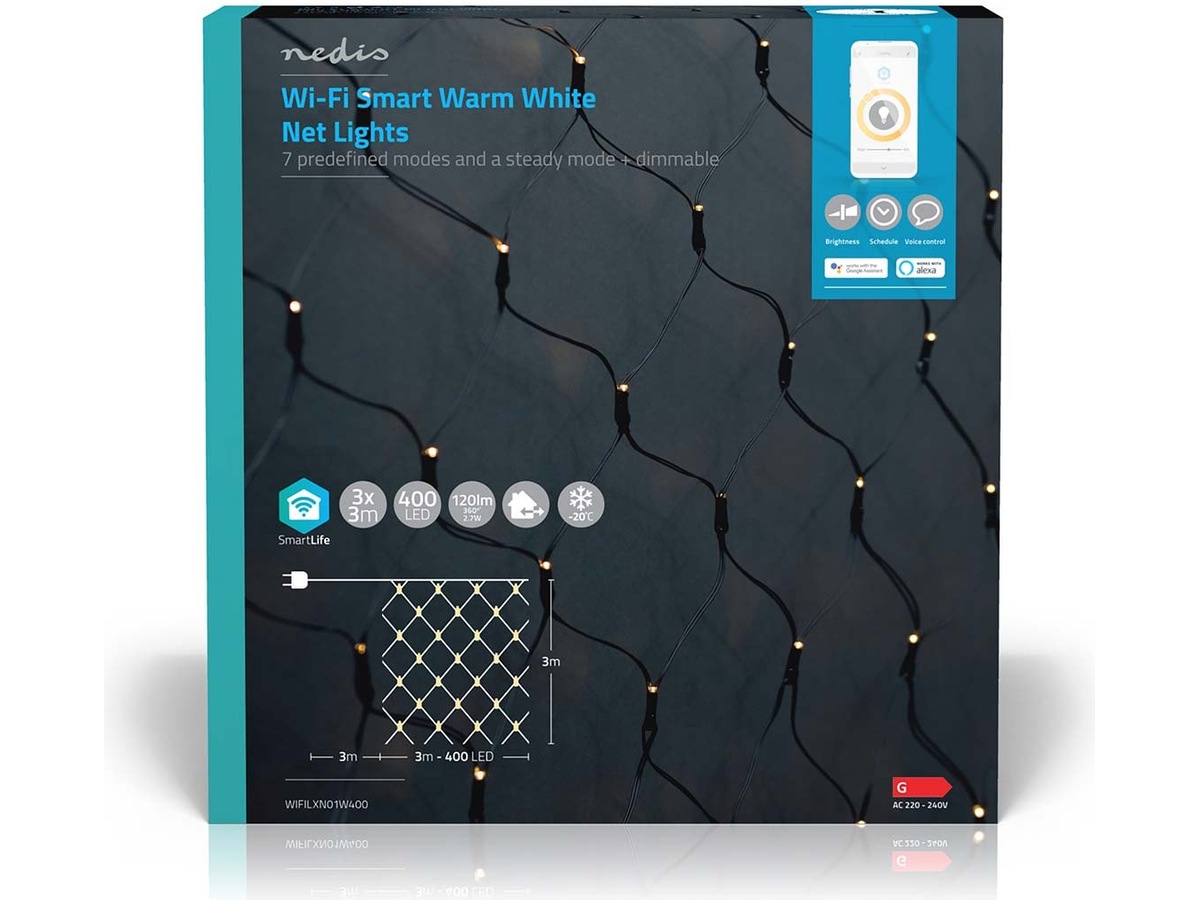 Dette brugervenlige Smart Wi-Fi-net med 400 varme hvide LED'er og et mål på 3 x 3 meter skaber nemt en magisk atmosfære på (flere) buske, facader, lofter eller andre genstande.
