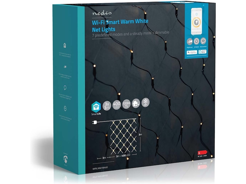 Dette brugervenlige Smart Wi-Fi-net med 400 varme hvide LED'er og et mål på 3 x 3 meter skaber nemt en magisk atmosfære på (flere) buske, facader, lofter eller andre genstande.
