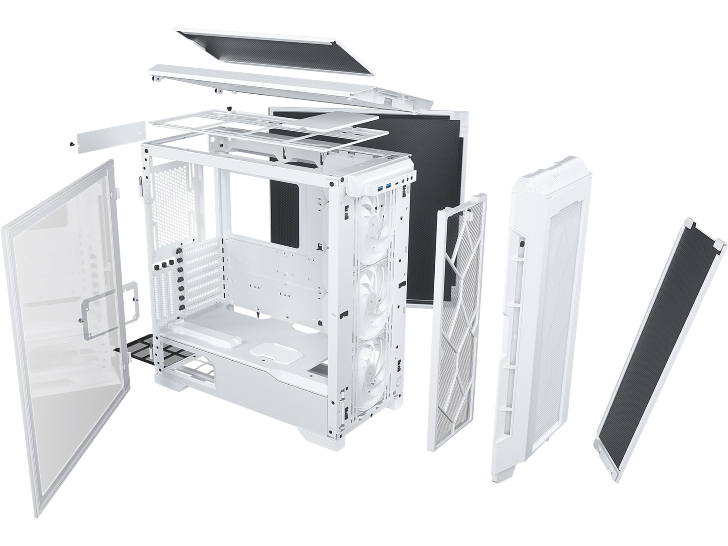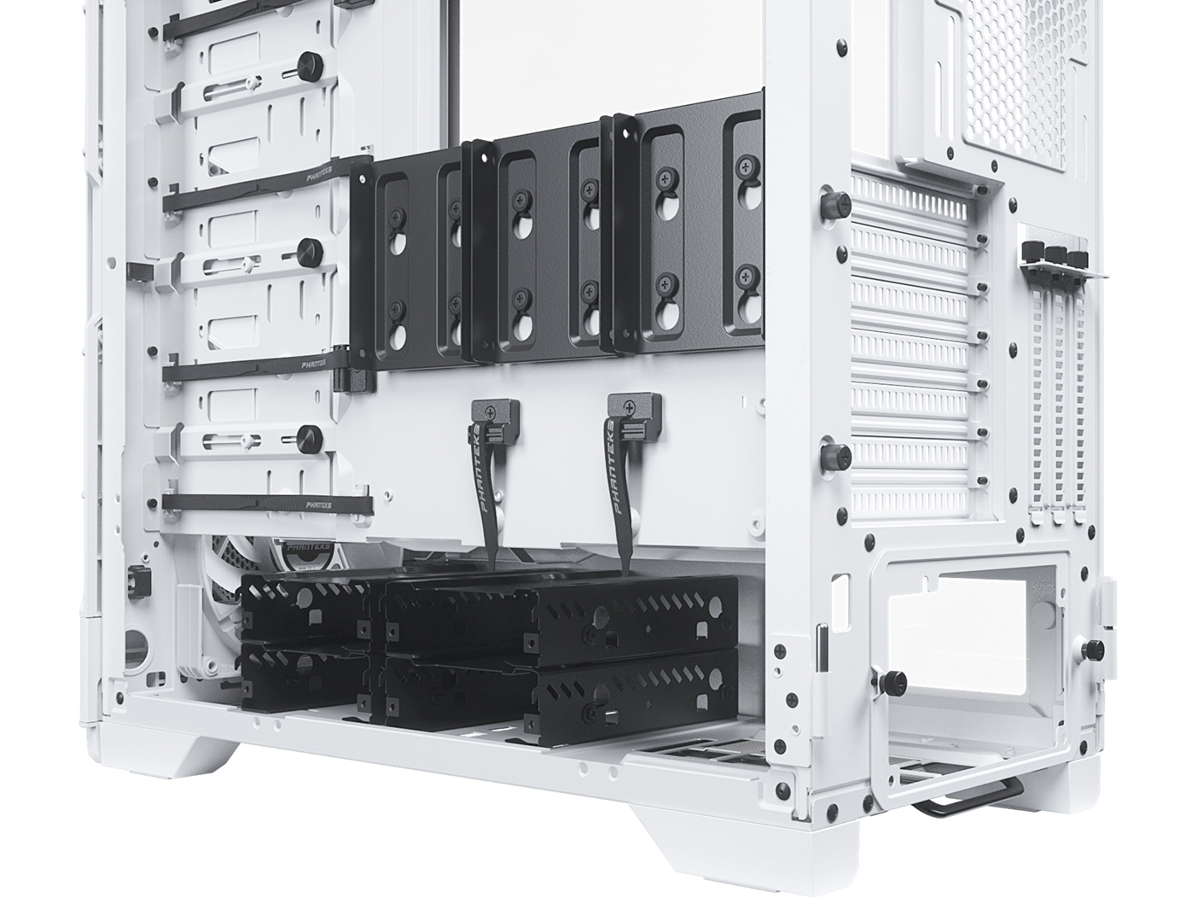 Eclipse P600S kan nemt skiftes fra stille tilstand til høj-luftstrøm-tilstand og omvendt. I høj-luftstrøm-tilstand kan luftgennemstrømningen i kabinettet maksimeres, når lydisoleringspanelerne fjernes for at afsløre Phanteks’ High-Airflow Fabric Mesh.