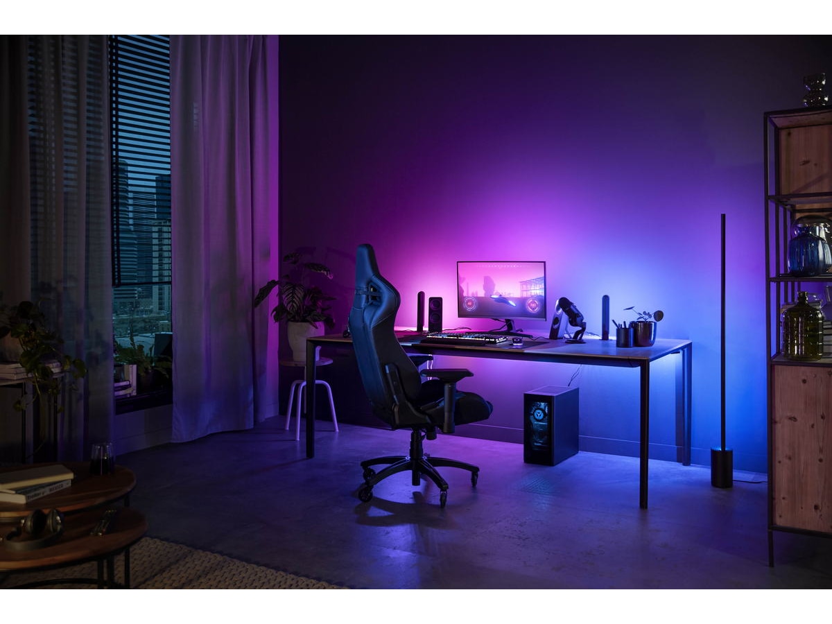 Som en del af Hue Play gradient serien er den skabt til at løfte din hjemmeunderholdning og give dig en unik fordybende oplevelse, hvor synkroniseret farverigt lys åbner op for en helt ny dimension af at nyde dit yndlingsindhold – uanset om det er TV-serier, film, musik eller gaming. Når du parrer din Play gradient PC lightstrip med den gratis Hue Sync desktop app, vil din spiloplevelse blive indhyllet i reaktive flerfarvede lyseffekter, der blinker, danser, lyser op og skifter farver i perfekt synkroni med den handling, der udspiller sig på din skærm. Den skaber fantastisk surround-belysning i sig selv, men den kan også kombineres med andre farvekompatible Hue pærer og lamper i dit Hue underholdningsområde, så hele rummet forvandles til spillets slagmark. Denne PC lightstrip passer til 24”- 27” skærme, og den kan fastgøres direkte på bagsiden af din skærm ved hjælp af de medfølgende monteringsstykker. Den fås også til større skærme og til et 3-skærmssetup. Dette PC lightstrip startsæt inkluderer en Hue Bridge, så du har alt, hvad du skal bruge for at opleve den sande magi ved reaktiv surround-belysning.