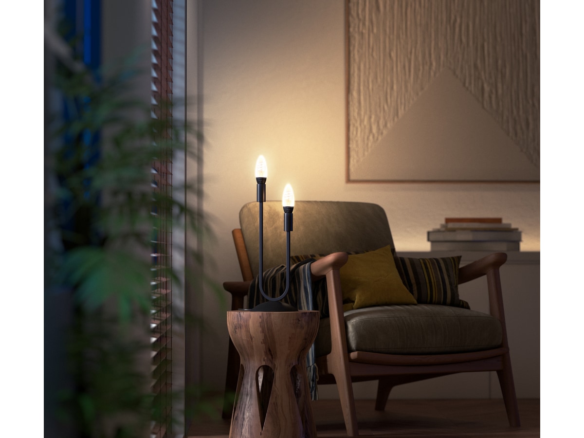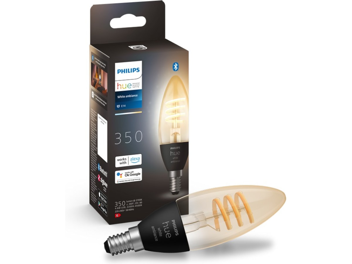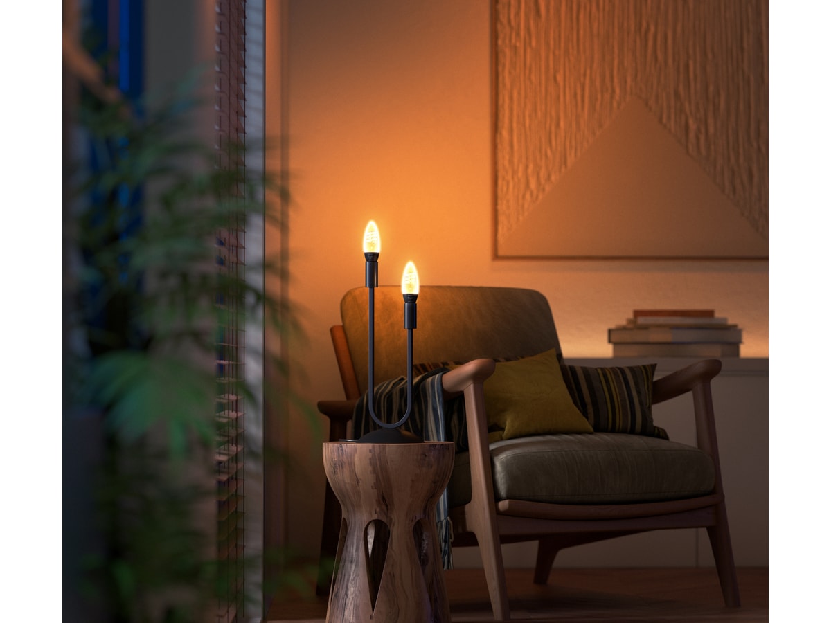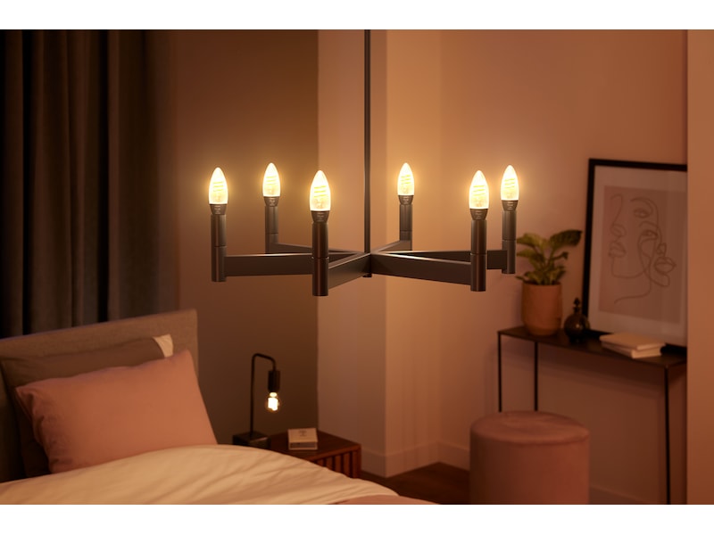 Med et snoet filament, der er synlig igennem det transparente glas, kombinerer filamentpærerne moderne funktioner med et både stilrent og elegant vintage design. Denne lille kertepære med E14-fatning er ideel til at tilføre både et klassisk og tidløst udtryk samt fantastisk stemningsbelysning til dine mindre lamper og lysekroner. Du kan også samle flere forskellige filamenter og justere hver enkelt pæres belysning for at skabe den helt rette atmosfære, skræddersyet til dit hjem og dine behov. Med White ambiance får du mulighed for at tilpasse lysets farvetemperatur, som du ønsker. Vælg kølige toner af hvidt lys for at skabe en energigivende atmosfære, og juster til varme hvide nuancer, når du skal slappe af. Du kan nemt styre og justere lyset via din Hue app og ethvert Hue tilbehør. Tilføjer du en Hue Bridge, får du adgang til alle funktionerne i Hue belysningssystemet.