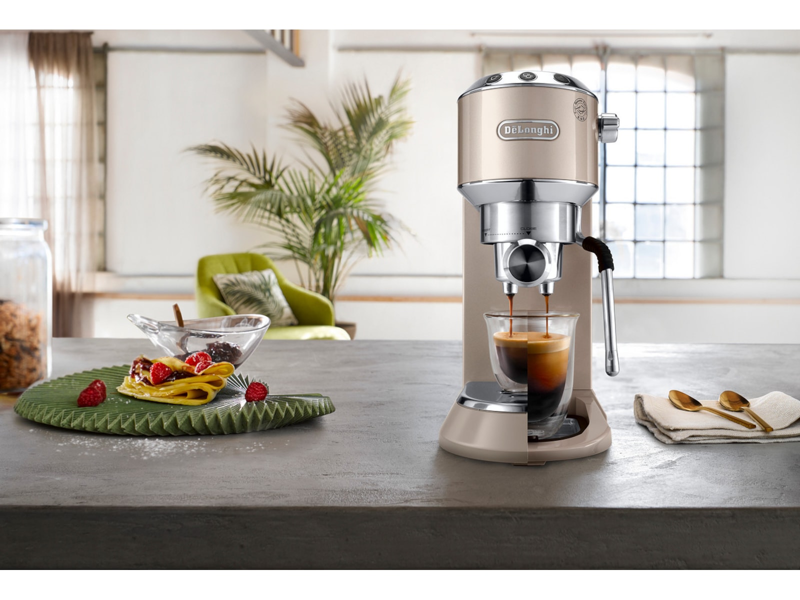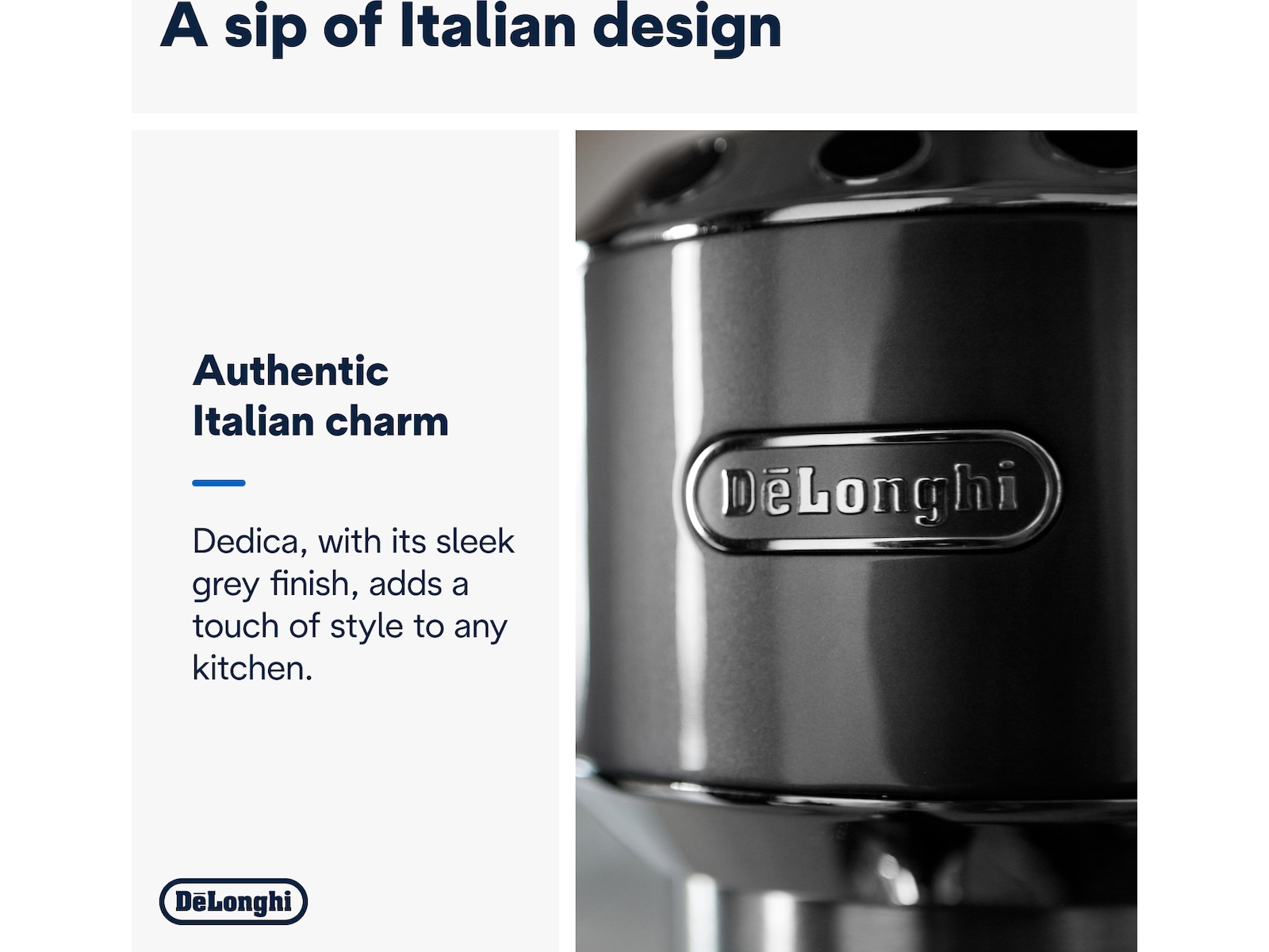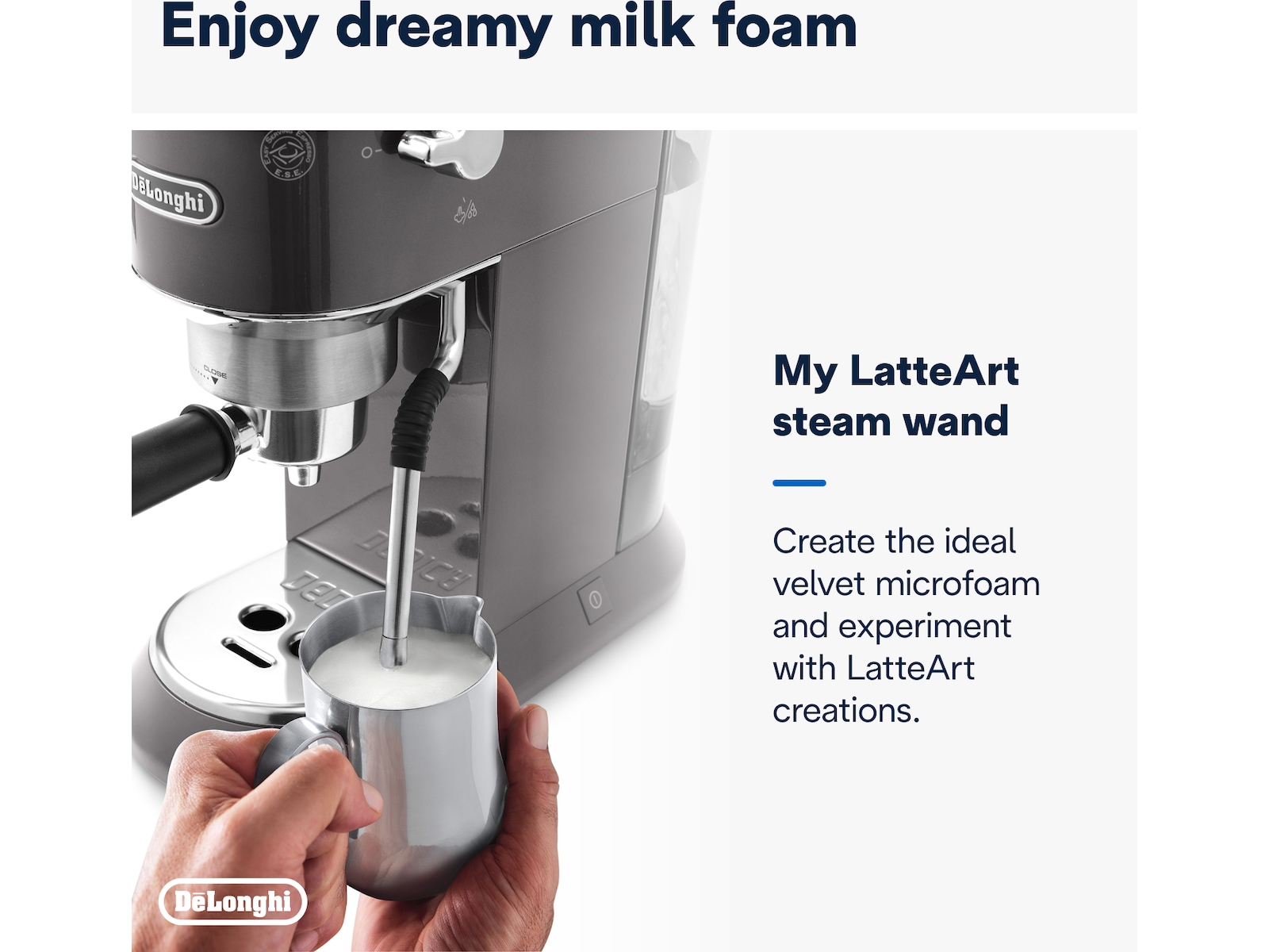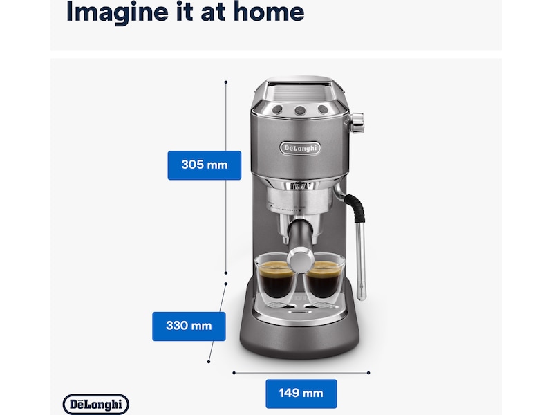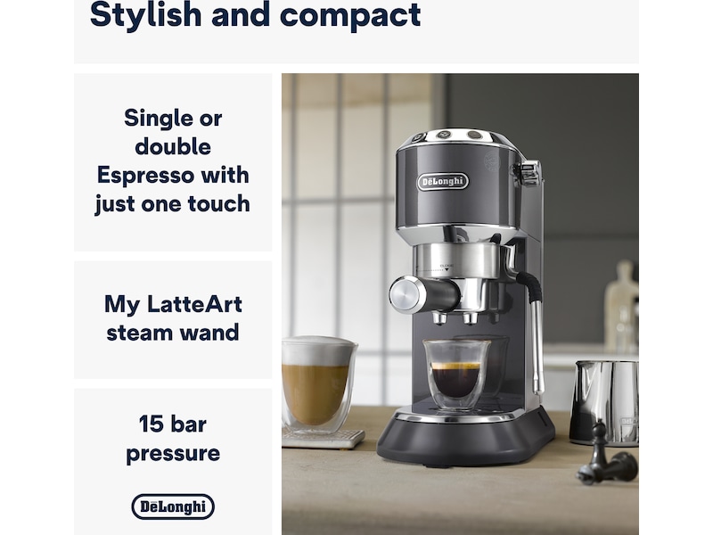 Den håndbetjente Dedica Arte-kaffemaskine tilføjer ekstra stil til det unikke og ikoniske Dedica-design. Kompakt og kraftfuld på samme tid er denne kaffemaskine det perfekte supplement til din køkkenbordplade, til fyldig morgenkaffe uden besvær, en silkeblød mikroskum-struktur til dine foretrukne mælkebaserede drikkevarer og ultimativ brugervenlighed og bekvemmelighed.