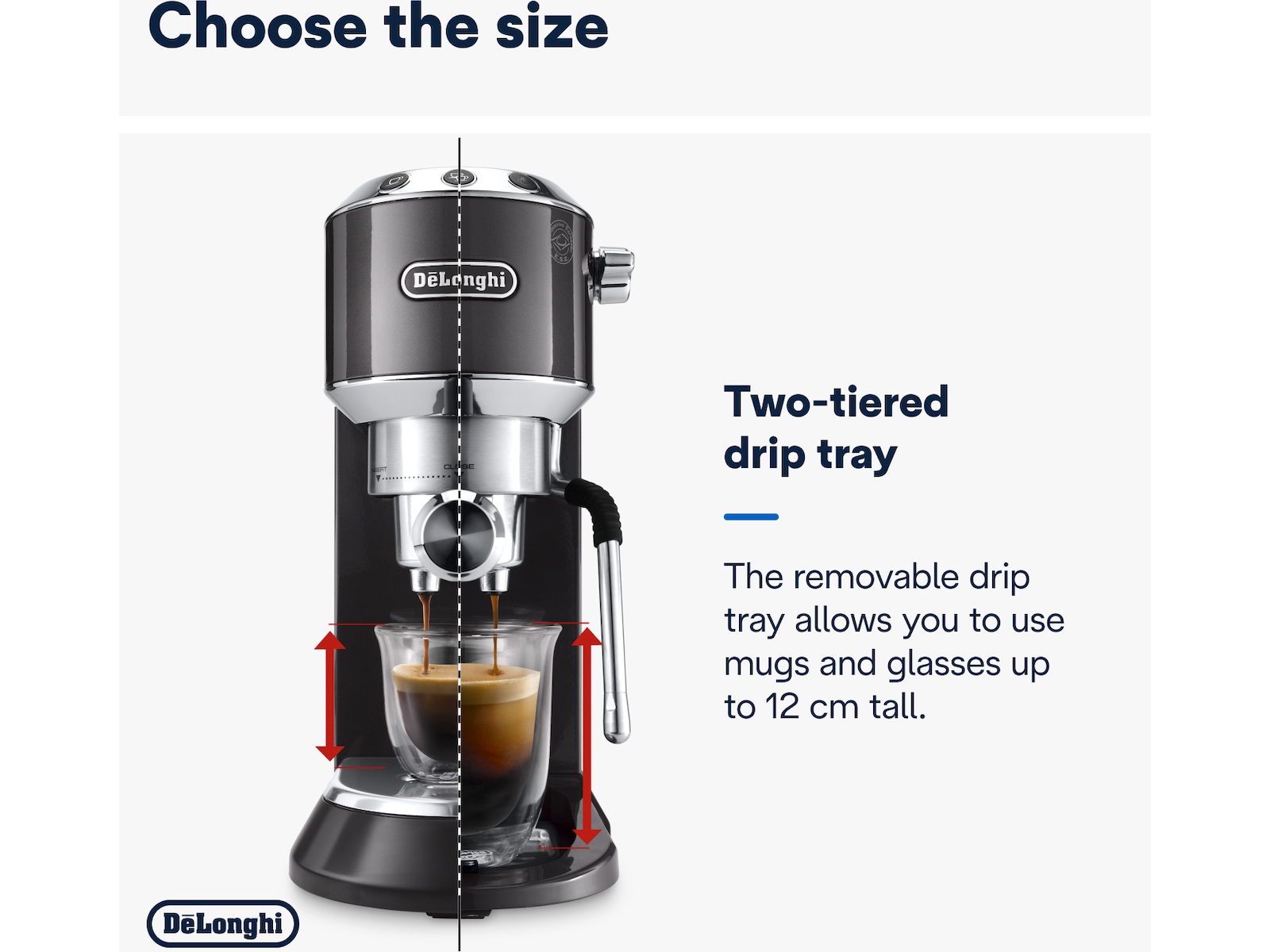 Den justerbare drypbakke passer til en række kopper, lave eller høje, op til 12 cm i højden