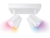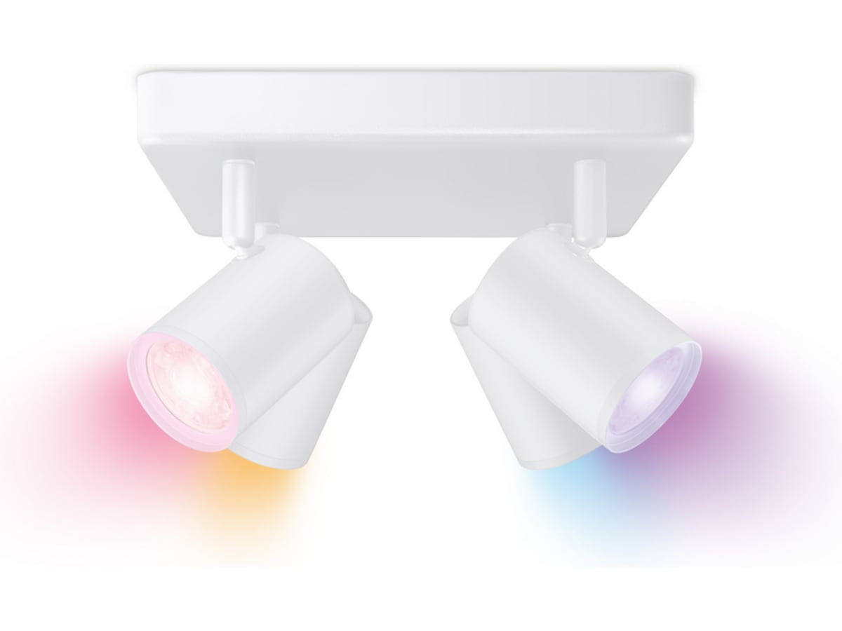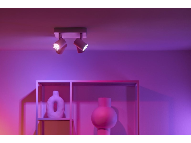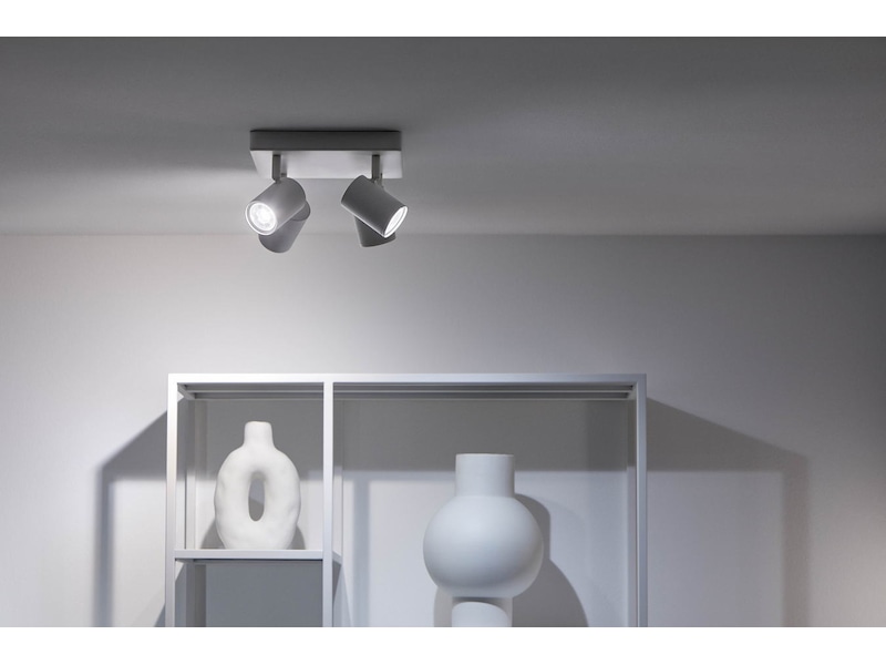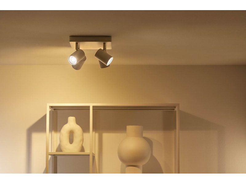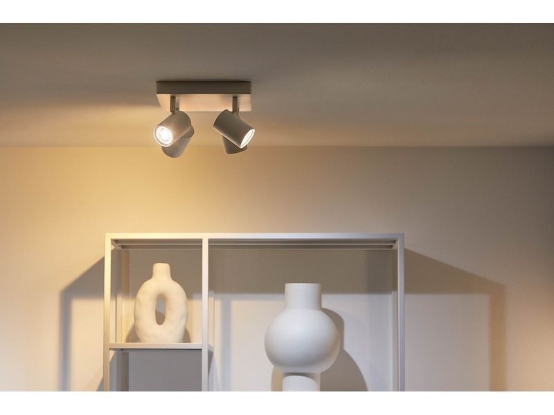 Med fire justerbare hoveder får du her en moderne lampe i hvid, der oplyser og fremhæver de områder og genstande, du holder allermest af. Dit hjem og dine øjne vil elske muligheden for at justere din belysning til 16 millioner forskellige farver og vælge lysets styrke og temperatur, så du endelig får LED-belysning i den høje kvalitet, du fortjener. Lad dig også imponere af komforten og glæden ved de dynamiske lysscener og unikke funktioner, der bader dit hjem i smukke, flerfarvede lyseffekter – der eksempelvis efterligner havets bølger eller en glødende pejs, eller som skaber en glidende overgang i din belysning ved at følge døgnets naturlige lysmønster.