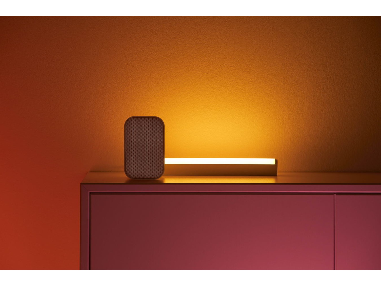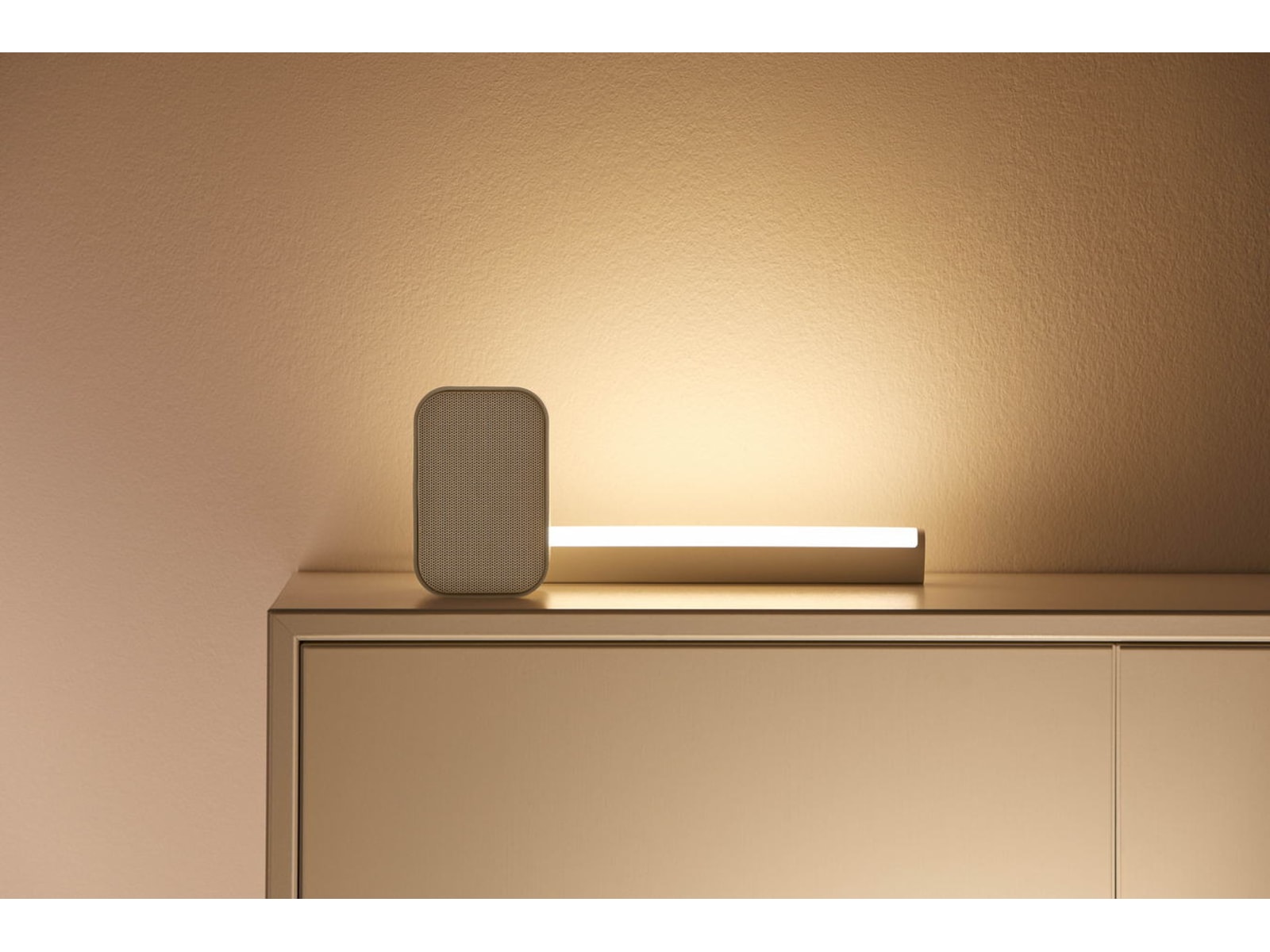 Den slanke lampe oplyser ethvert rum med masser af farverigt lys, og den er let at passe ind på lidt plads. Ved at vippe lampen til en af siderne kan du nemt justere lysvinklen. Og hvis du ønsker endnu mere lys, kan du sagtens forbinde to af lamperne for at fordoble lyseffekten. For at skabe den helt rette stemning til at matche dit humør eller din givne aktivitet kan du vælge mellem 16 millioner farver og enhver nuance af varmt til køligt hvidt lys. Brug kølige toner af dagslys til at booste din energi og koncentration, og juster til bløde varme toner af hvid, når du skal slappe af.