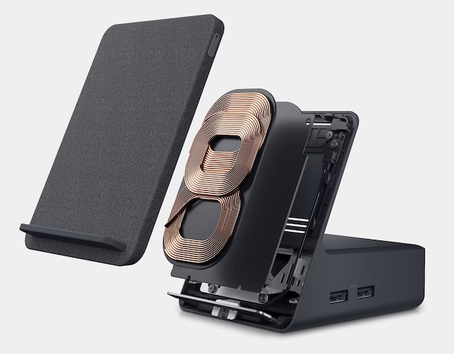 Oplad din Qi-aktiverede smartphone eller øretelefoner på verdens første dockingstation til bærbar computer med en trådløs opladningsstander.