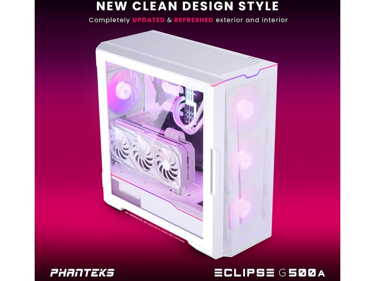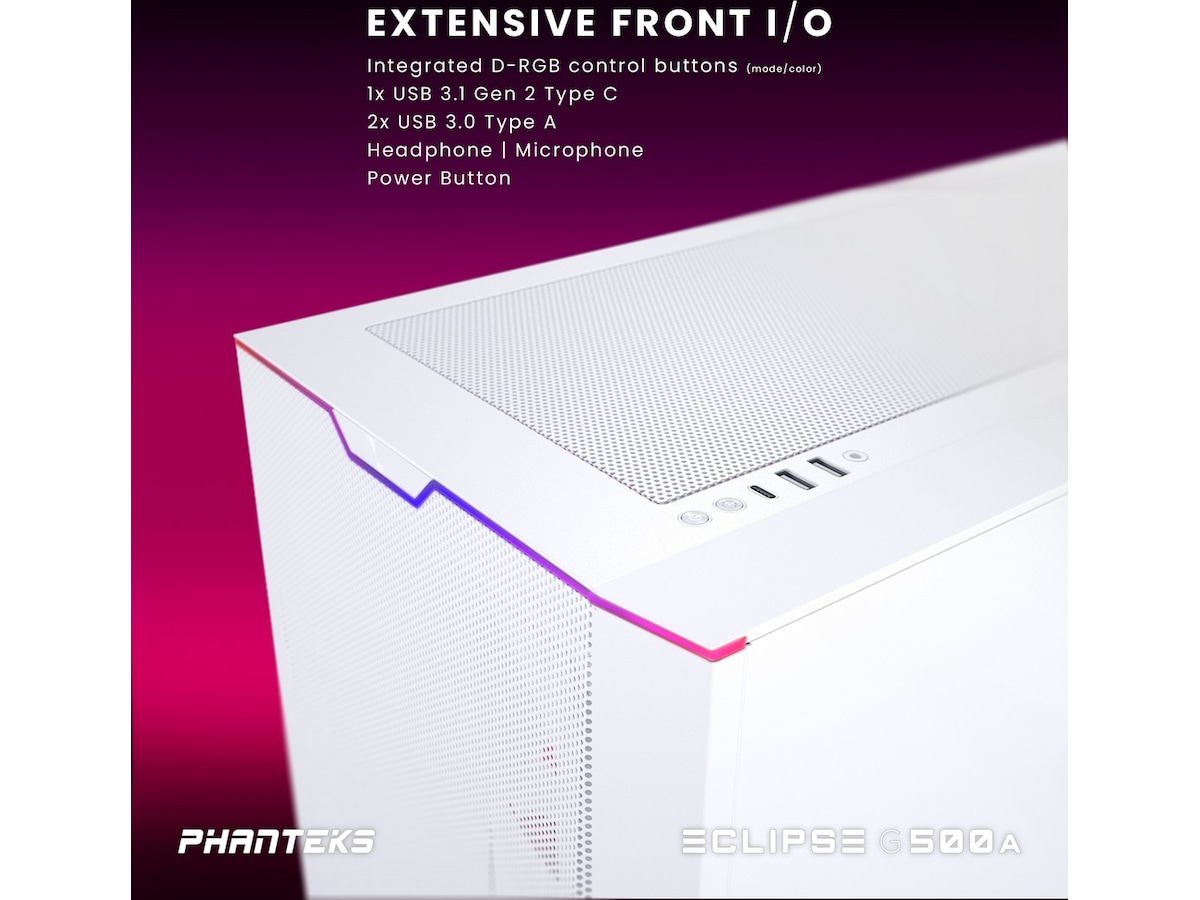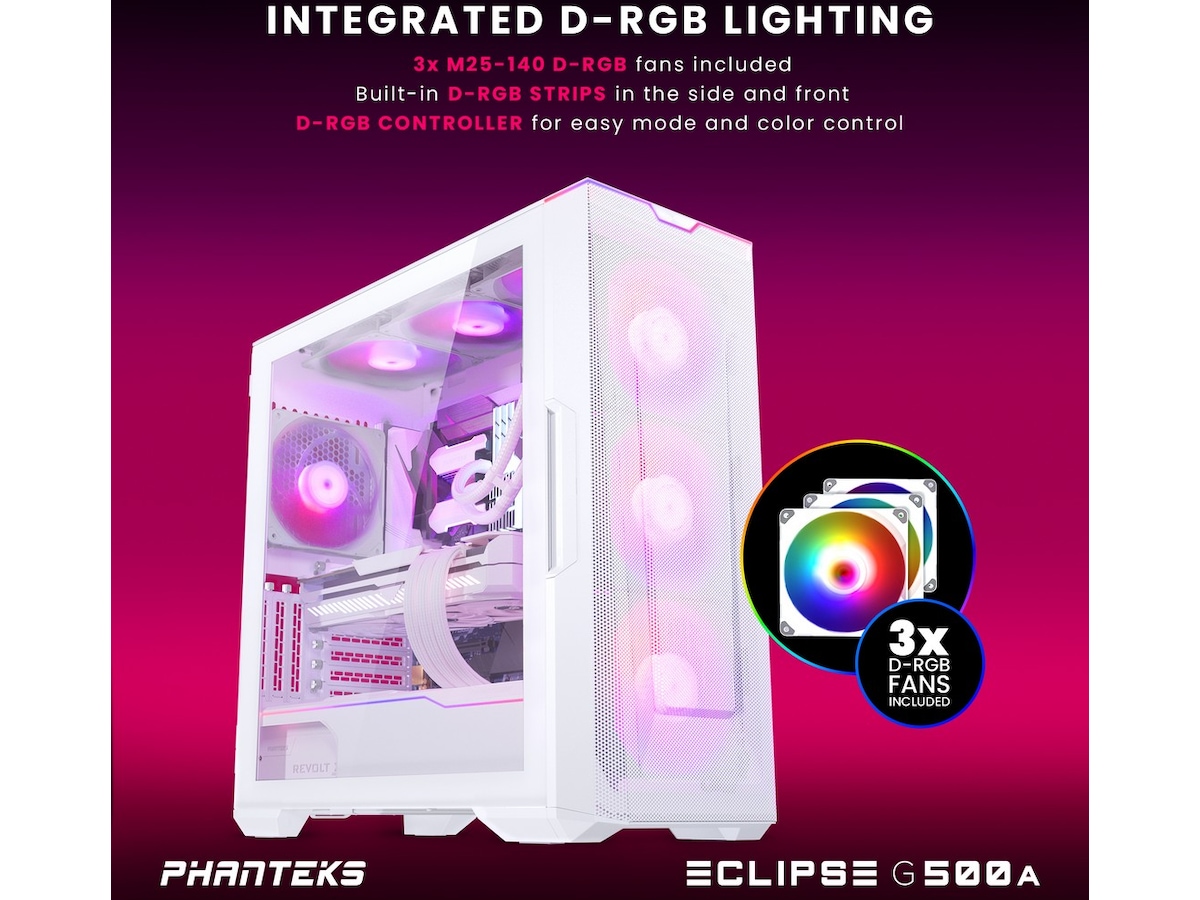Udstyret med sin egen Digital-RGB-controller gør Eclipse G500A belysning let. Den er softwarefri med manuel styring og programmeret med smagfulde lyseffekter lige ud af æsken. Tre M25-140 D-RGB-blæsere er forudinstalleret, og en LED-strimmel er integreret langs PSU-skjoldet og toppanelet. Som alle Phanteks' belysningsprodukter kan Digital-RGB-controlleren udvides med flere belysningsprodukter og/eller synkroniseres med bundkort for at give mulighed for softwarestyring.
