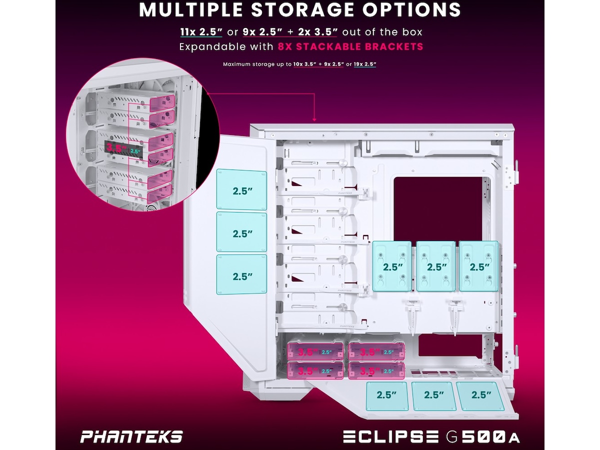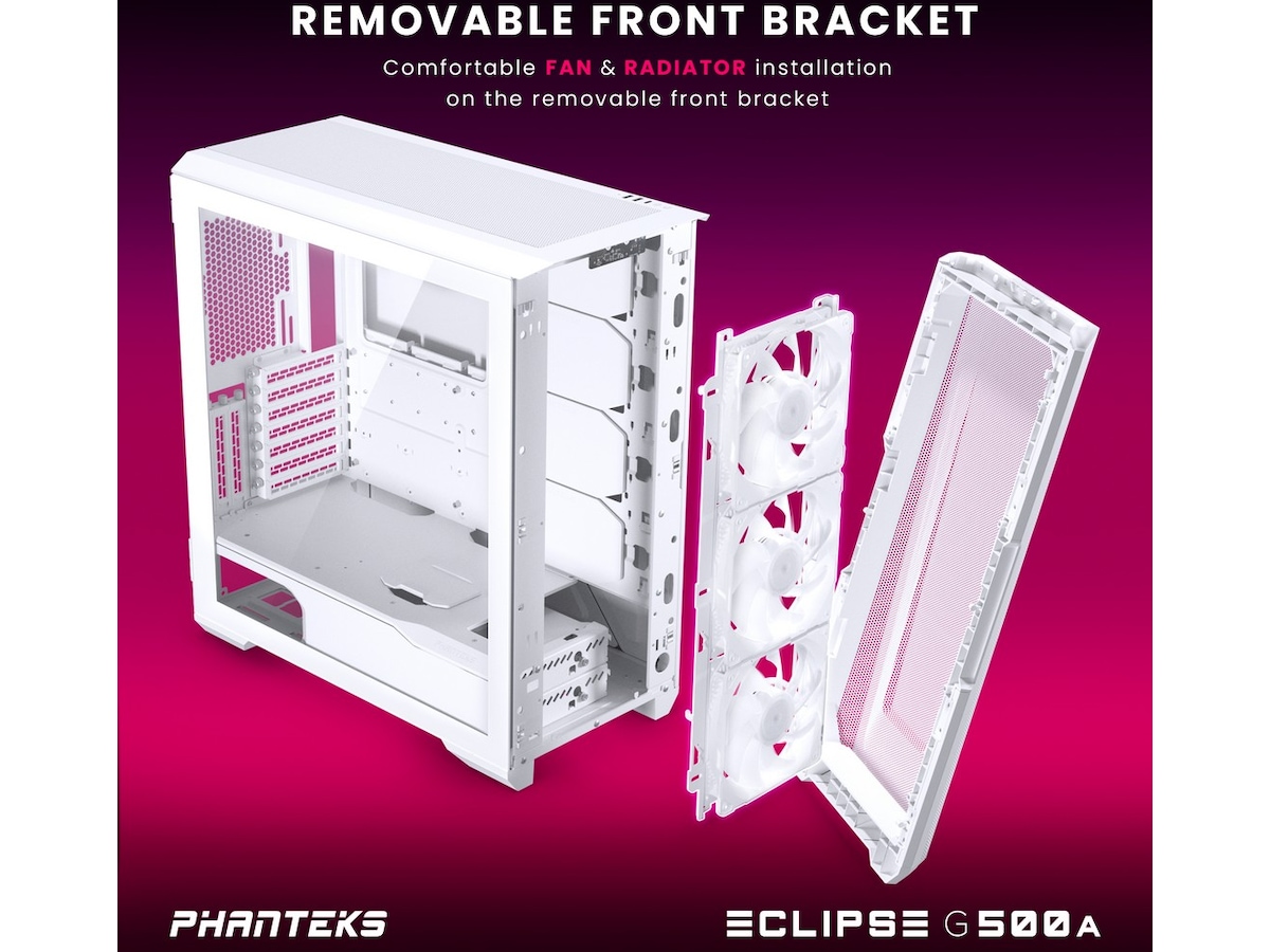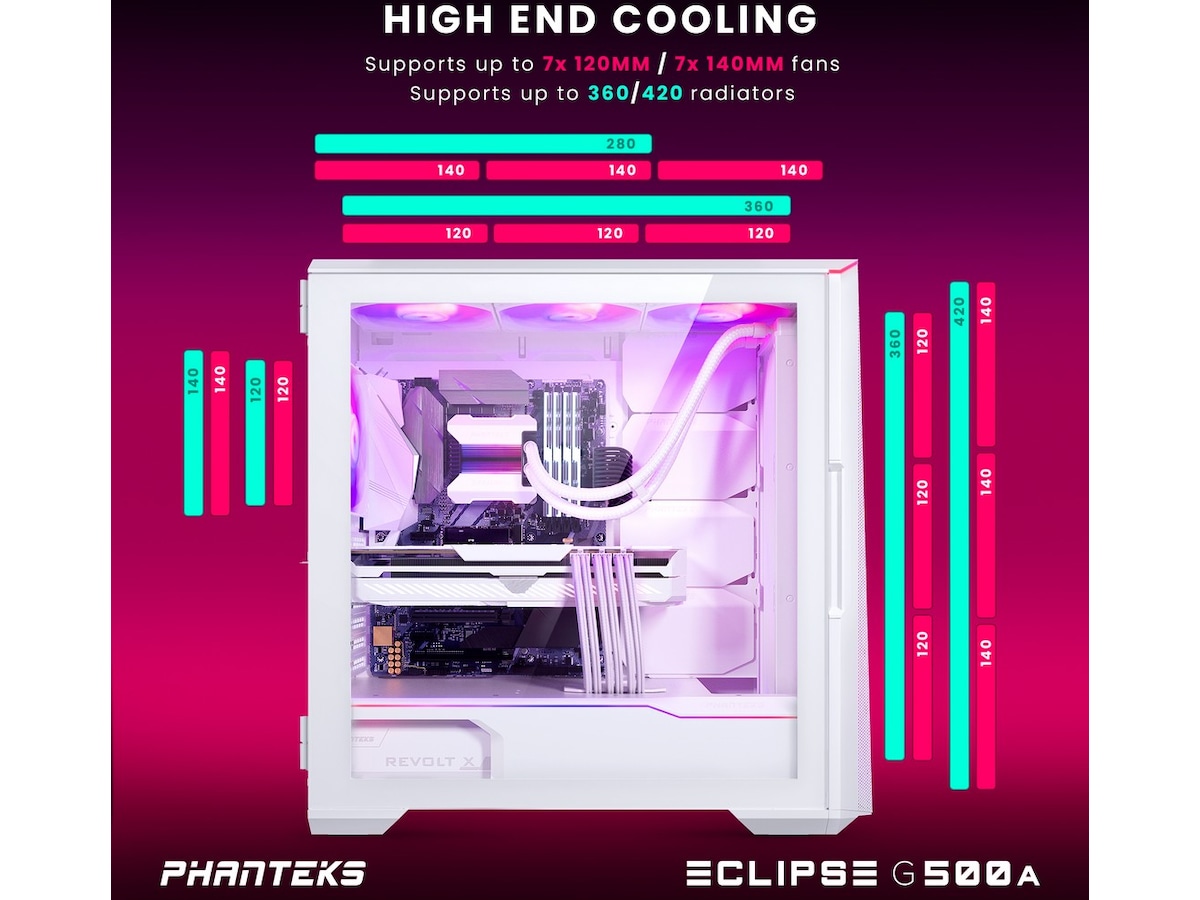 Udstyret med sin egen Digital-RGB-controller gør Eclipse G500A belysning let. Den er softwarefri med manuel styring og programmeret med smagfulde lyseffekter lige ud af æsken. Tre M25-140 D-RGB-blæsere er forudinstalleret, og en LED-strimmel er integreret langs PSU-skjoldet og toppanelet. Som alle Phanteks' belysningsprodukter kan Digital-RGB-controlleren udvides med flere belysningsprodukter og/eller synkroniseres med bundkort for at give mulighed for softwarestyring.