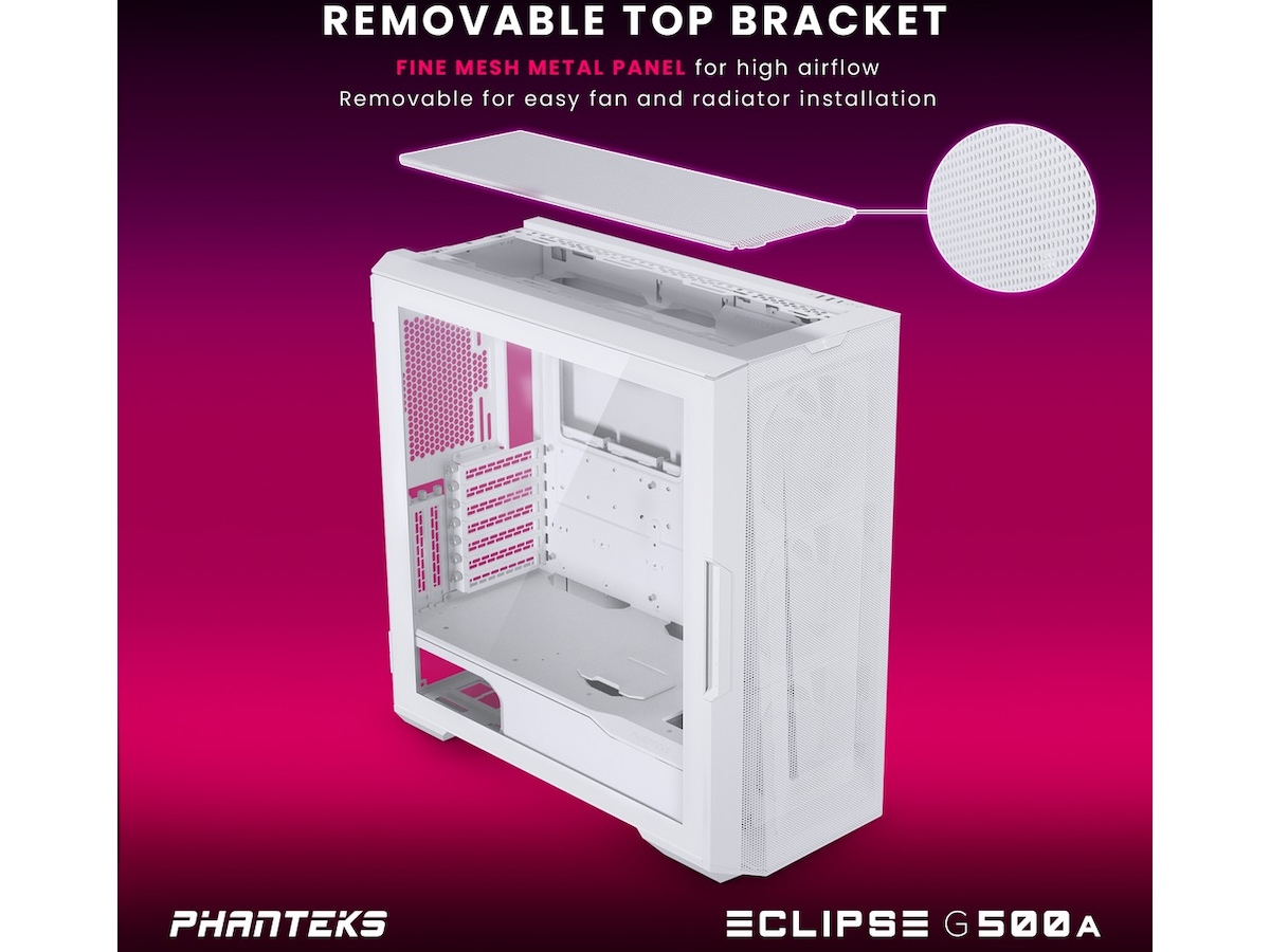 Eclipse G500A skubber grænserne med sit høje luftstrømsdesign for at låse op for næste generations CPU- og GPU-ydeevne. Både front- og toppanelerne har Phanteks Ultra-fint Performance Mesh-design, der kombinerer høj luftstrømning med fremragende støvfiltrering, alt-i-en. Med sit rummelige interiør er G500A klar til kraftfulde gaming-opsætninger, der tilbyder 420 radiator foran, 360 radiator i toppen, samtidig med den har masser af plads til GPU'er i fuld længde, flere HDD- og SSD-placeringer og en lodret GPU-monteringsmulighed .