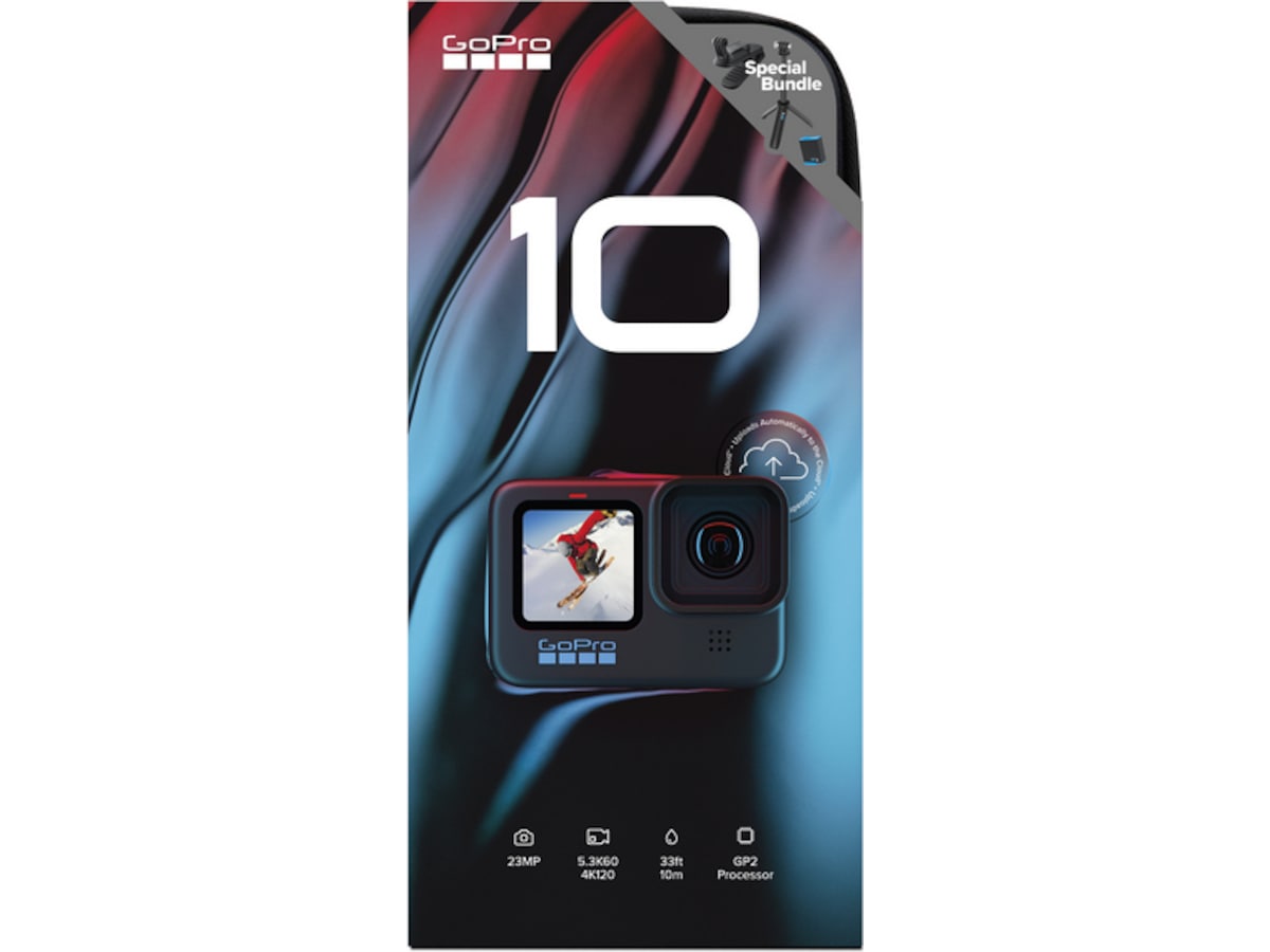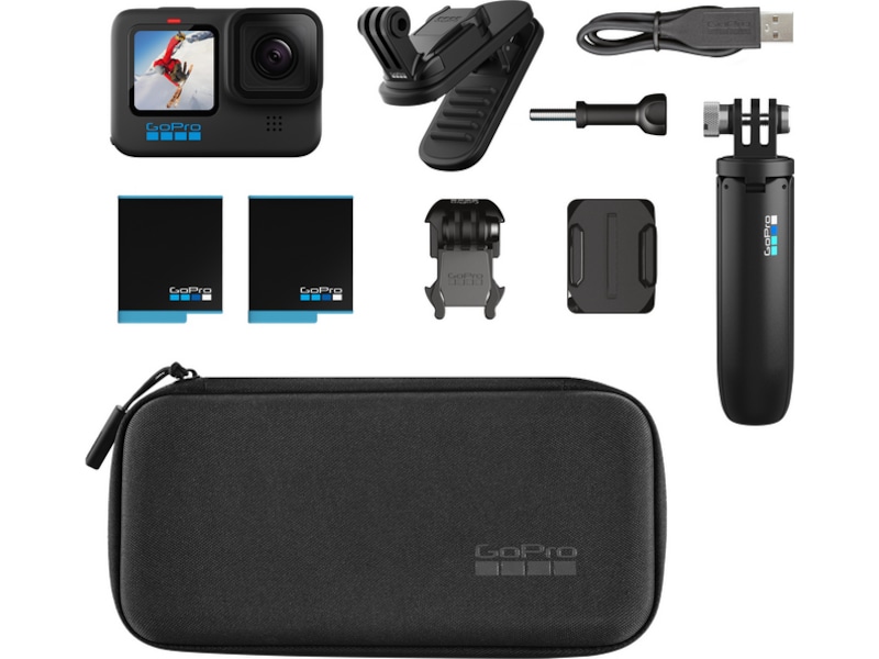 Den inkluderer den kraftfulde HERO10 Black, der optager 5,3K-video med dobbelt billedhastighed1 og 23 MP-billeder, Shorty (miniforlængerstang + stativ), magnetisk drejeklemme, ekstra batteri og etui.