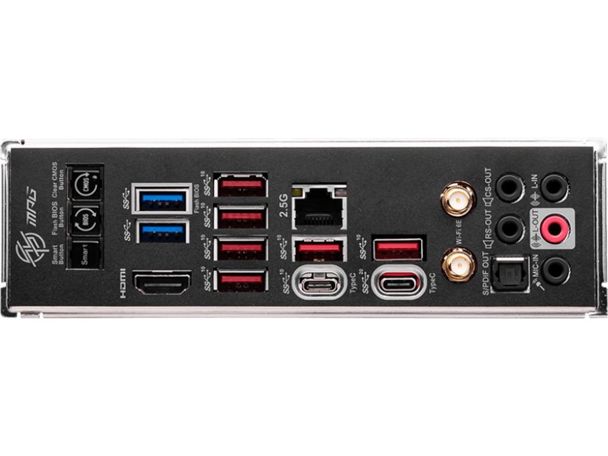 | Interface | 1 x USB-C 3.2 Gen2x2, 1 x audio linje-ud (bagtil) - mini-jack, 6 x USB 3.2 Gen 2, 1 x USB-C 3.2 Gen 2, 1 x LAN (2.5Gigabit Ethernet), 1 x SPDIF-ud, 1 x audio linje-ind - mini-jack, 2 x antenne, 1 x audio linje-ud - mini-jack, 2 x USB 3.2 Gen 1, 1 x audio linje-ud (centrum/subwoofer) - mini-jack, 1 x HDMI, 1 x mikrofon - mini-jack |