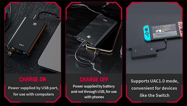 Komfortabel brug i flere scenarier, uanset om du bruger Q3s som en bærbar forstærker eller stationært på skrivebordet. Med en enkelt kontakt kan du vælge, om enheden skal oplades, mens den er i brug, eller om du skal bruge det interne batteri, når du bruger den bærbart. Hvis du bruger enheden i AUX-tilstand, holder batteriet i 23 timer, og i USB-tilstand op til 12 timer.