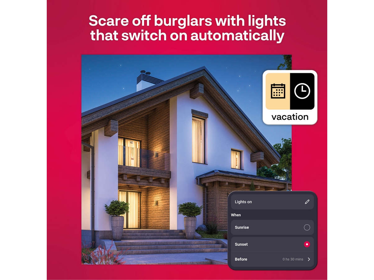 Når du er væk hjemmefra eller på ferie i den mørke årstid, kan du nemt simulere din tilstedeværelse. Indbrudstyve er ofte impulsive og risikovillige, så et mørkt hus er mere attraktivt. Tidligere kunne du gøre dette med timer-kontakter, men smart belysning giver dig mulighed for at gøre det meget lettere, uanset hvor du er.