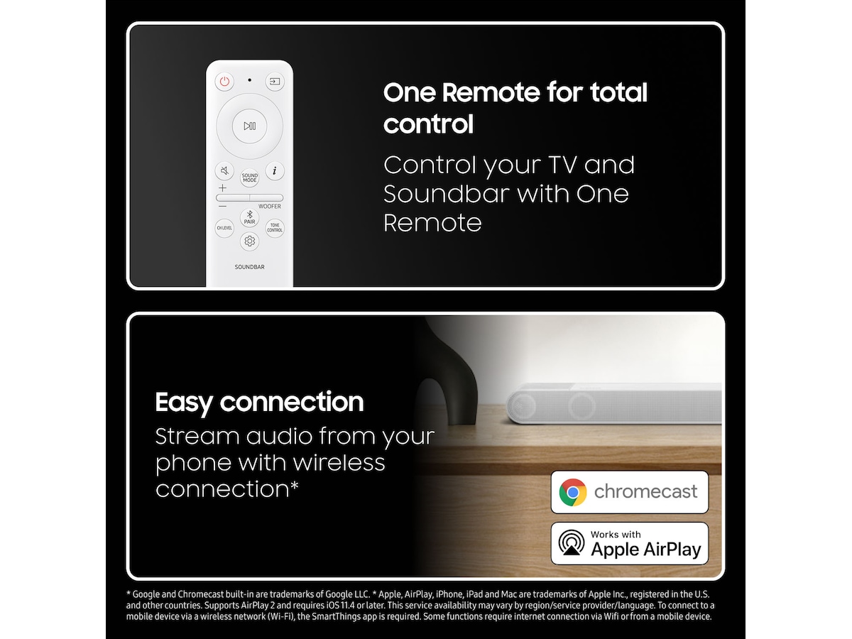 - Oplev altomsluttende tredimensionel lyd, nu med trådløs forbindelse mellem TV og Soundbar.