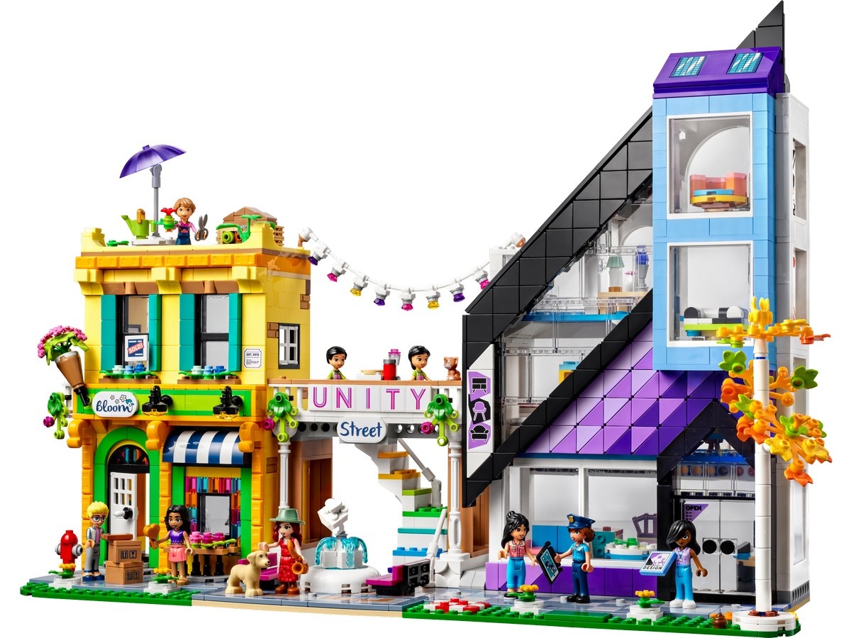• En iøjnefaldende udstillingsmodel – Kreative sjæle kan bygge og tilpasse en detaljeret model med lejlighed og butikker med LEGO® Friends sættet Midtbyens blomster- og designbutikker (41732)