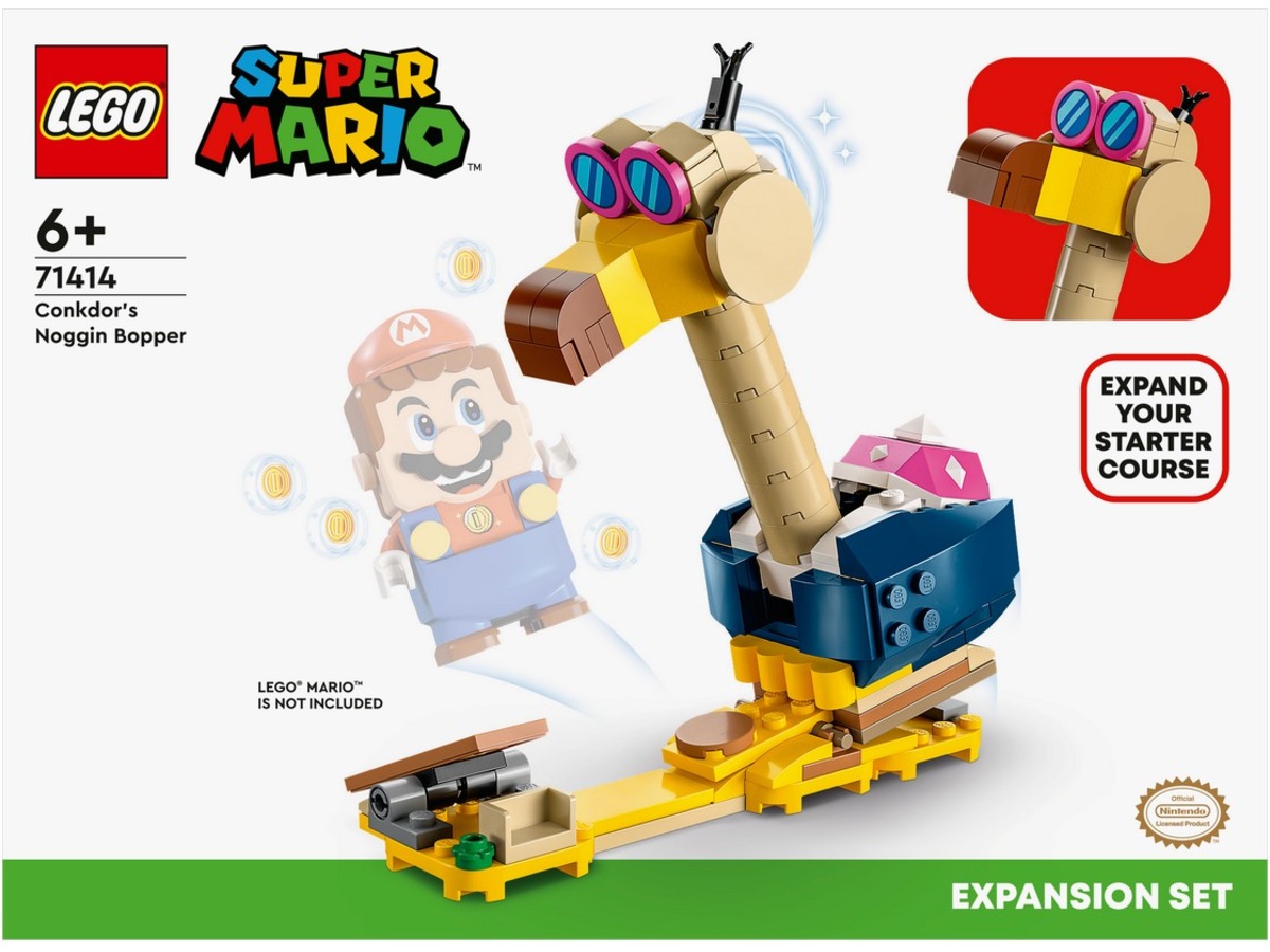 LEGO® Super Mario™ fans kan kæmpe mod en stor karakter med udvidelsessættet Conkdors næbhakker (71414). Det indeholder en stor, fjendtlig Conkdor-figur, der kan bygges, og som en interaktiv LEGO® Mario™, LEGO® Luigi™ eller LEGO® Peach™ kan kæmpe mod. Hop på udløseren, og undgå Conkdor'ens store næb og lange hals, når den angriber, og tramp den derefter på hovedet for at besejre den. Hop på vippen for at få Conkdor'en til at rejse sig igen. Tilhørende app Dette kreative legesæt er en fantastisk gave til børn fra 6 år, der har en LEGO Super Mario startbane (71360, 71387 eller 71403 – påkrævet for at lege og spille). Download LEGO Super Mario appen for at få byggevejledninger, inspirerende idéer og meget mere, der kan forbedre deres kreative oplevelse. Nå nye niveauer LEGO Super Mario startbaner og udvidelsessæt er samlerlegetøj, der lader fans udvide, ombygge og tilpasse deres egne unikke baner og opleve spil og leg med møntindsamling.