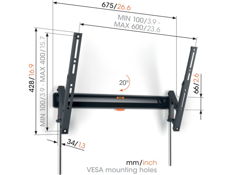 Leder du efter et sikkert og stilfuldt TV-vægbeslag til dit store fladskærms-TV? Et, som du kan vippe, fordi du gerne vil montere dit TV lidt højere på væggen, for eksempel i dit soveværelse? Hvis ja, er dette COMFORT vippe-TV-vægbeslag det perfekte valg. Du kan vippe det op til 20° for at skabe den ideelle betragtningsvinkel. Vægbeslaget er velegnet til store TV'er fra 40 til 77 tommer og med en vægt op til 35 kg.