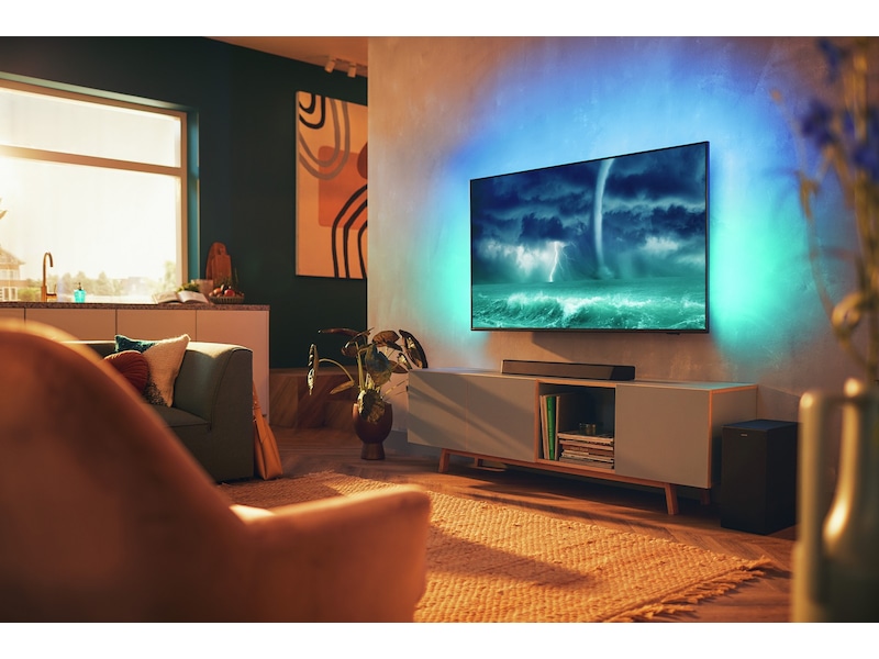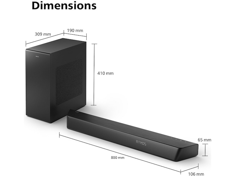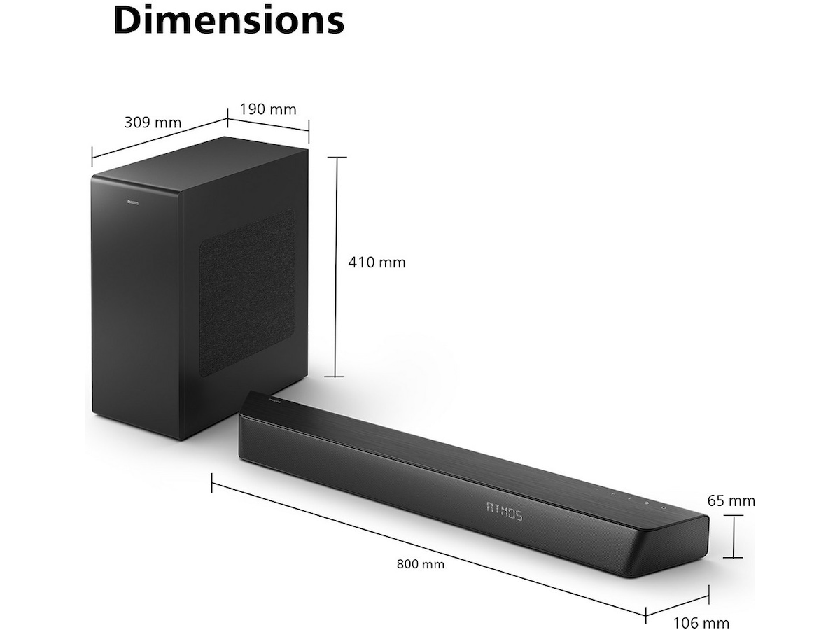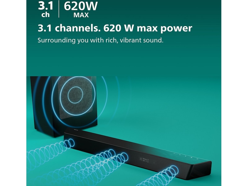 Den utrolige 3.1 soundbar bruger Dolby Atmos til at levere bølger af virtuel 3D-lyd og giver dig et nyt niveau af lydoplevelse. 8" subwooferen med trådløs forbindelse giver en fantastisk bas for at give dine medier den dybde, de fortjener.