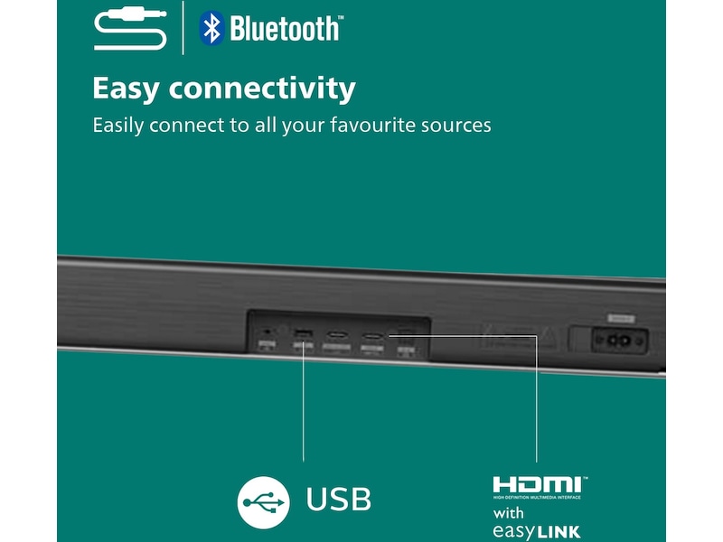 Denne fantastiske soundbar har Philips Easylink-teknologi for at give dig maksimal brugervenlighed. Uanset om du vil justere EQ-tilstande, bas, diskant, lydstyrkeindstillinger på enheden eller soundbaren, har du kun brug for én fjernbetjening!