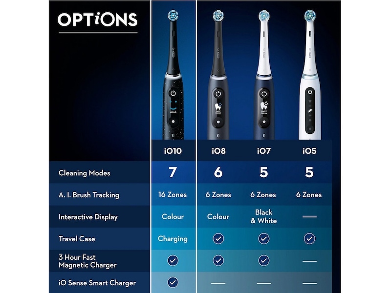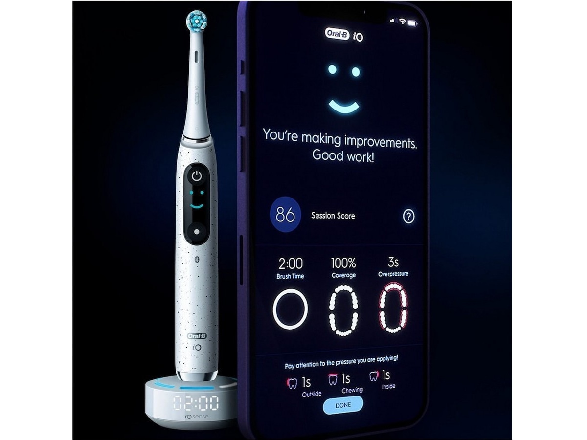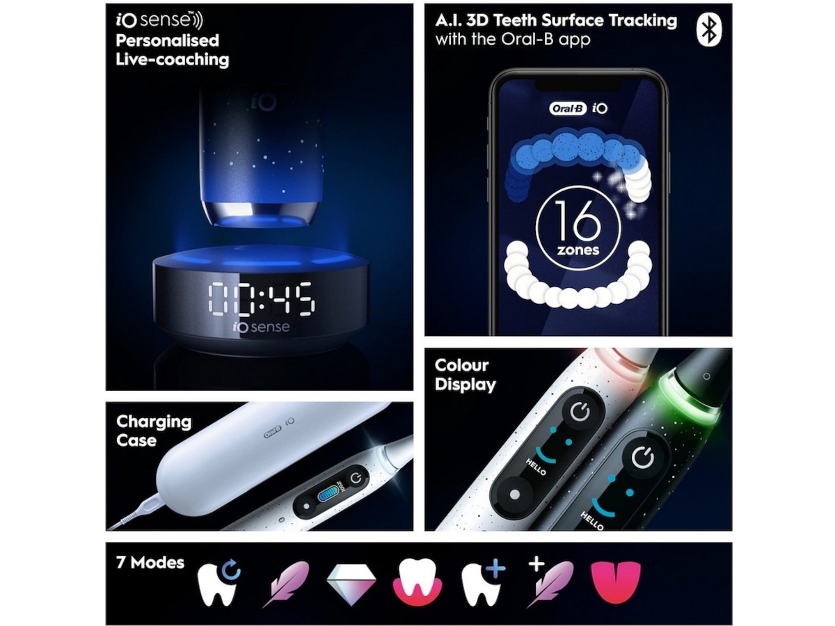 Den elektriske iO 10 tandbørste med den revolutionerende smarte iO Sense oplader tilpasser din børstning med realtidsrespons, og guider dig til perfekt dækning, børstetid og børstetryk for en dejlig, ubesværet tandrensning.