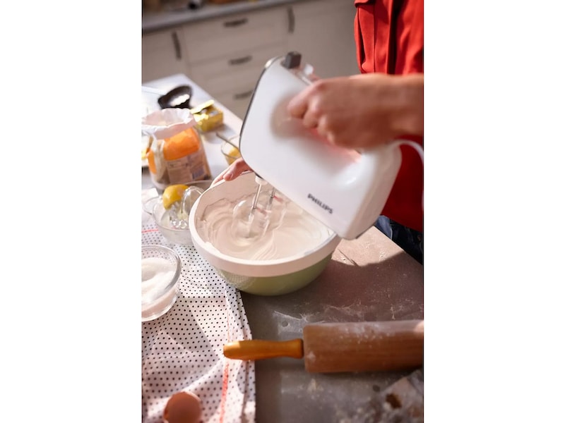 Med Philips-mixeren kan du lave lækre, luftige kager og brød til hele familien. Luftig, kegleformet piskning giver kortere pisketid og jævnere kagedej. Den kraftfulde motor på 450 W gør det nemt at arbejde med den mest seje dej.