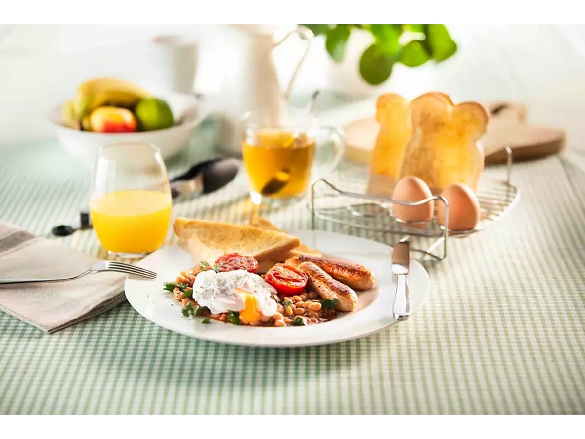 Med dette særlige Philips Airfryer-morgenmadssæt kan du tilberede en komplet morgenmad til din familie på én gang. Lær at lave en sund morgenmad med pocherede æg, brød, pølser og grøntsager