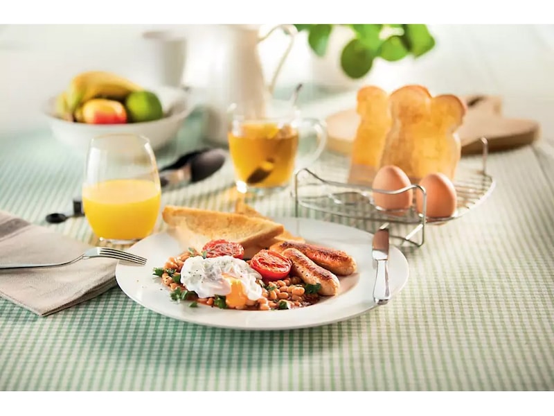 Med dette særlige Philips Airfryer-morgenmadssæt kan du tilberede en komplet morgenmad til din familie på én gang. Lær at lave en sund morgenmad med pocherede æg, brød, pølser og grøntsager
