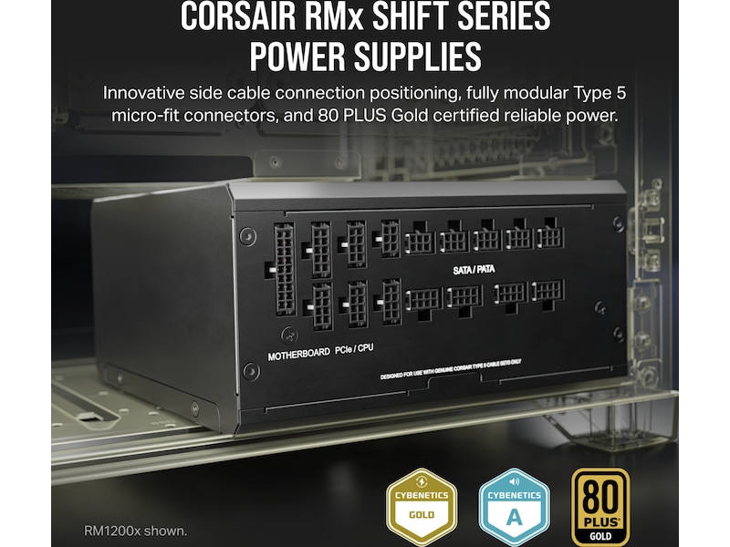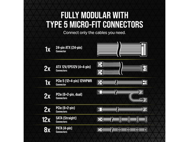 Fuldt modulopbygget CORSAIR Type 5 Gen 1 mikrotilpassede PSU-kabler, så du kun tilslutter de kabler, dit system har brug for, så det fylder mindre.