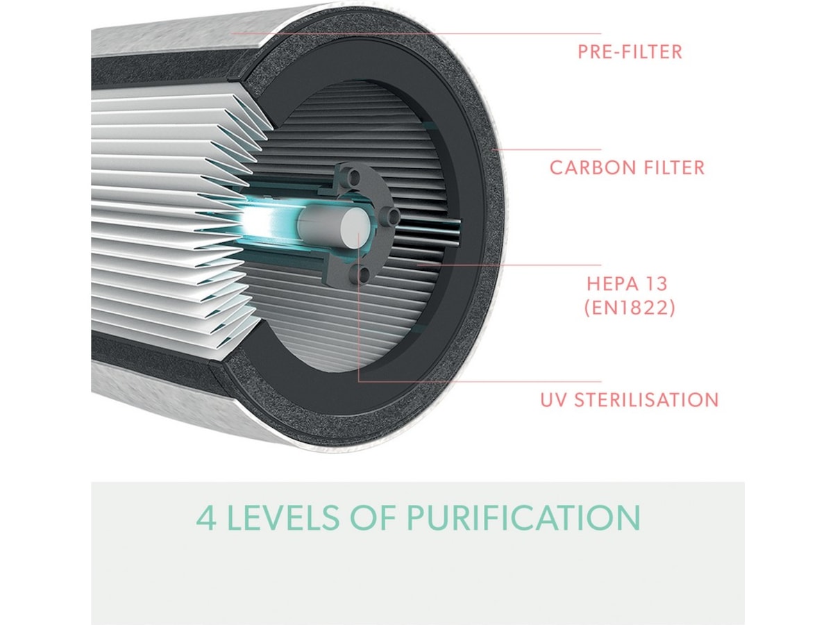 H13 HEPA-filtret med 360 graders filtrering fångar upp minst 99,95 % av partiklar mellan 0,1 och 0,3 mikron (MPPS) och ett kolskikt avlägsnar VOC-gaser/luktämnen från alla håll. UV-C-lampan dödar bakterier och bakterier som kan fastna i filtret.