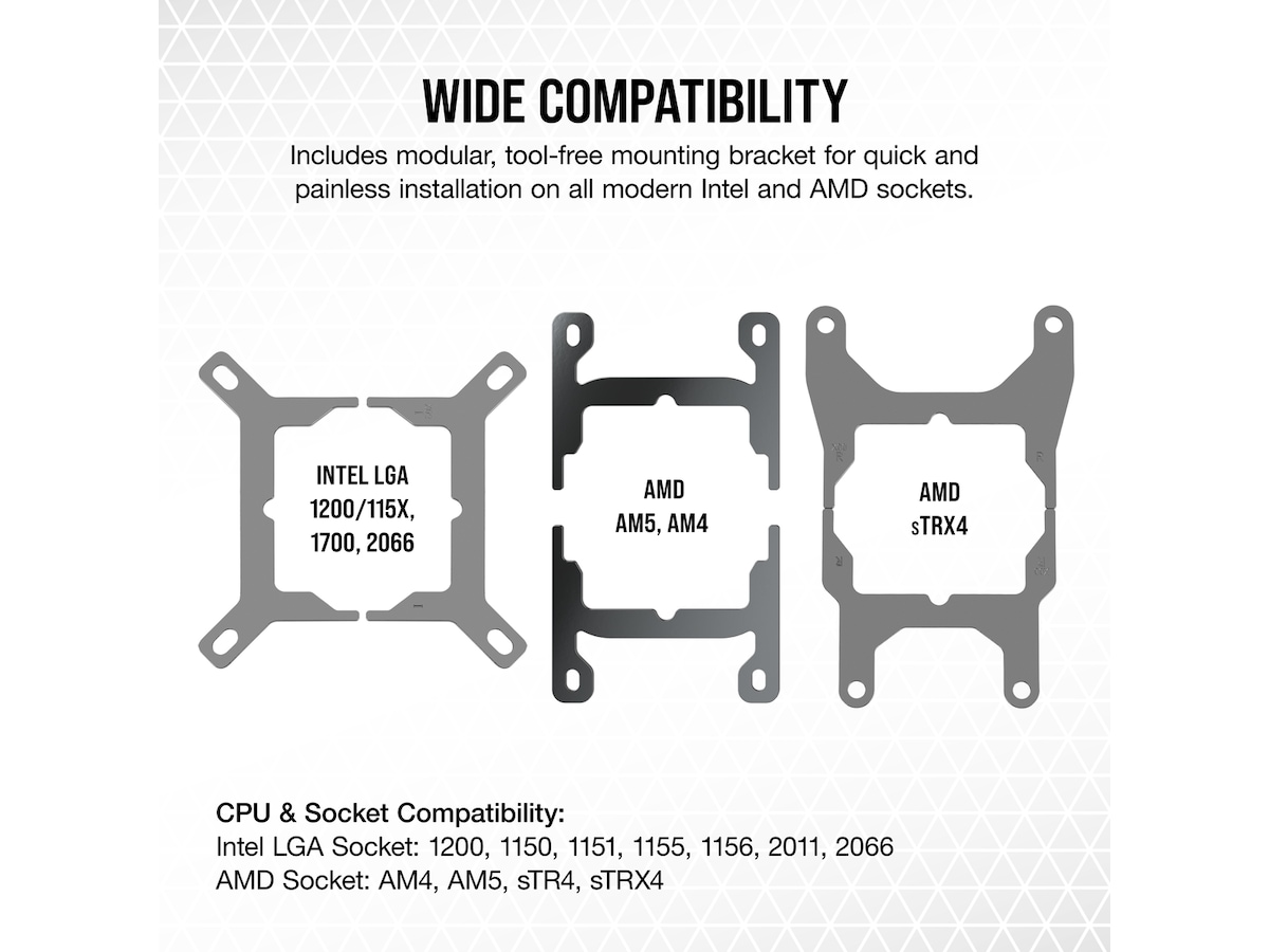 Forlænget slangelængde på 400 mm (H100i, H115i) / 450 mm (H150i, H170i), modulære værktøjsfri monteringsbeslag og påført XTM70 termisk pasta gør det nemt at installere på de nyeste Intel® og AMD® bundkortsokler, inklusive LGA 115X , 1200, 1700, 2011 og 2066, plus AMD Socket AM4, AM5 og sTRX4/sTR4.