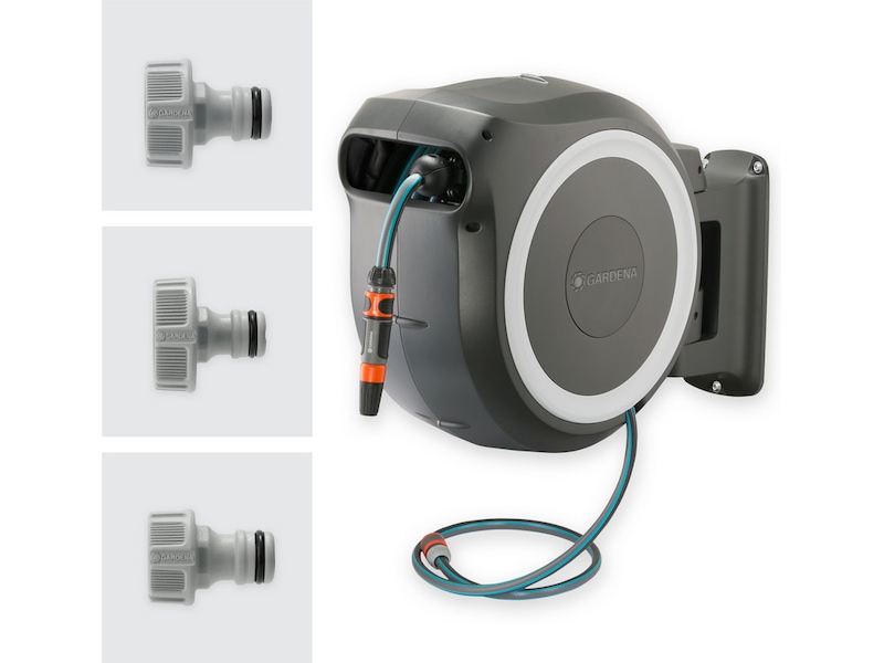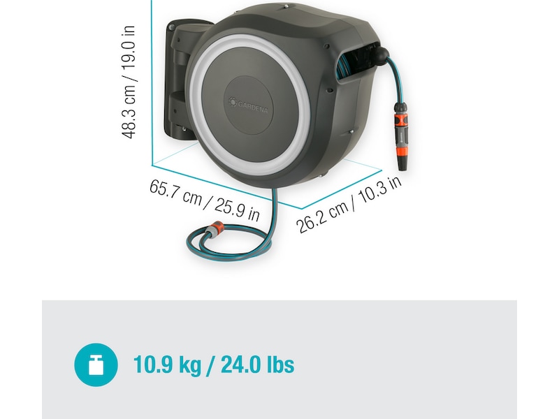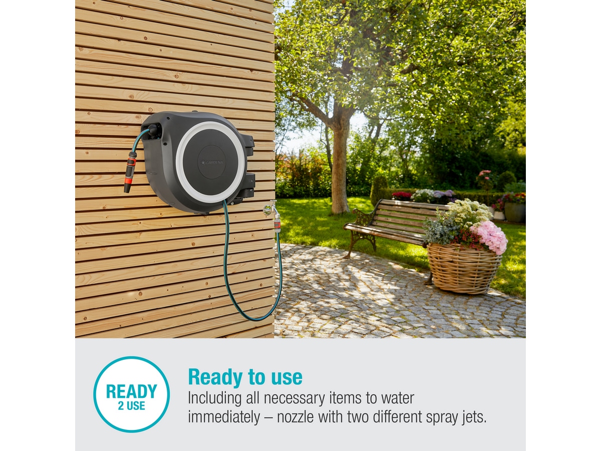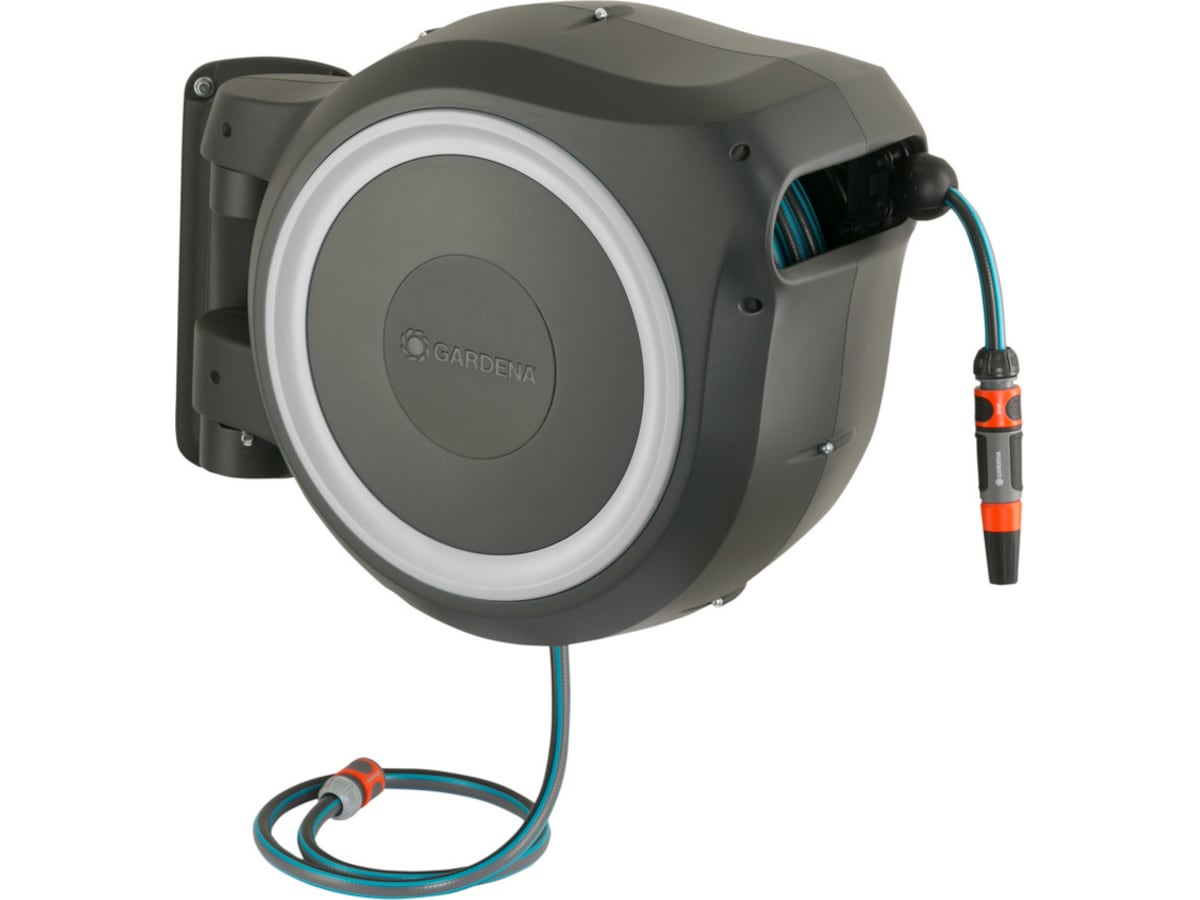 Den vægmonterede RollUp M/L slangeboks kommer med et vægbeslag, en 25 meter vandslange, en tilslutningsslange, alle nødvendige GARDENA systemdele og en dyse med to forskellige sprøjtedyser.