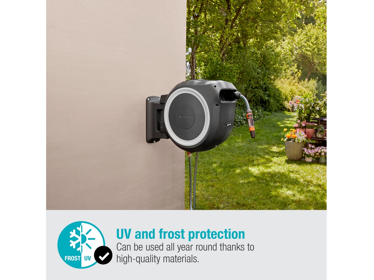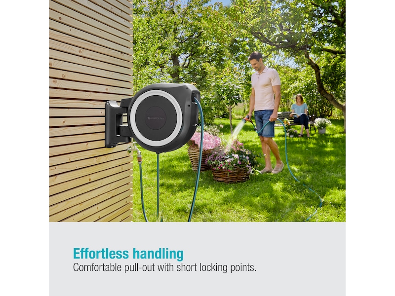 Det praktiske vægbeslag gør, at slangetromlen kan drejes 180° for at følge dine bevægelser rundt i haven. Det gør det nemt at vande i haven, med maksimal bevægelsesfrihed og en slange der ikke filtrer sig sammen. Du behøver ikke rode med knæk og sammenfiltring for at rulle slangen sammen: Et lille ryk for enden af slangen er nok til at frigøre låsen.
