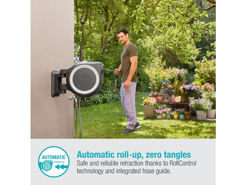 Med et let træk i enden af slangen aktiveres den integrerede stålfjeder og spoler slangen automatisk og pålideligt tilbage. RollControl-teknologien sikrer langsom og sikker tilbagetrækning, uanset hvor langt slangen rulles ud.