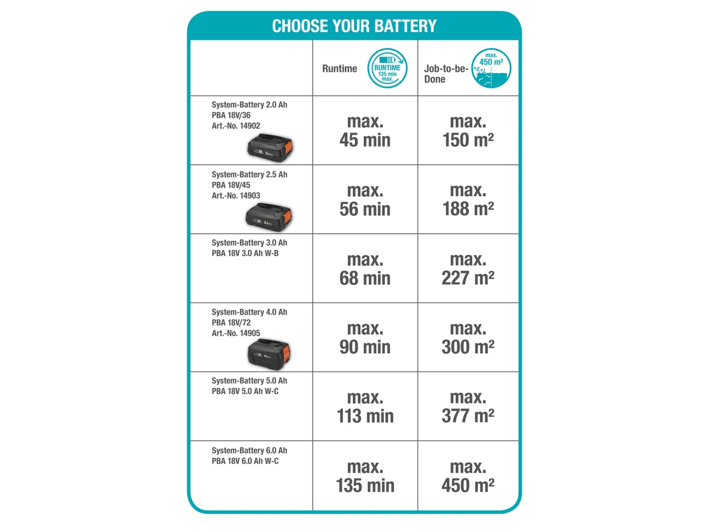 ComfortCut 50/18V P4A "Ready-to-use kit" leveres med 18 V batteri og oplader fra POWER FOR ALL ALLIANCEN. Batteriets driftstid er op til 45 minutter eller 150 kvadratmeter hæk.