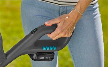 Batteridrevet græstrimmer SmallCut 23/18V, sæt fra GARDENA hjælper dig med at trimme plænekanter ubesværet takket være den lave vægt på kun 2,0 kg med batteri. Det store håndtag og det ekstra fronthåndtag imponerer med deres veldesignede ergonomi. Dette giver dig mulighed for at indtage en behagelig kropsholdning, mens du trimmer græsplænen. RotorCut plastknivene med et arbejdsspænd på 23 cm giver dig mulighed for at lave præcise, effektive og rene snit. SmallCut er særligt velegnet til at klippe plænehjørner eller smalle områder, som en plæneklipper ikke kan nå. LED-indikatoren i håndtaget viser dig hele tiden batteriets ladestatus. Fuldt opladet holder 2,0Ah-batteriet, der er inkluderet i leveringsomfanget, omkring 40 minutter. Derudover er der opbevaret fire reserveskæreblade i håndtaget.