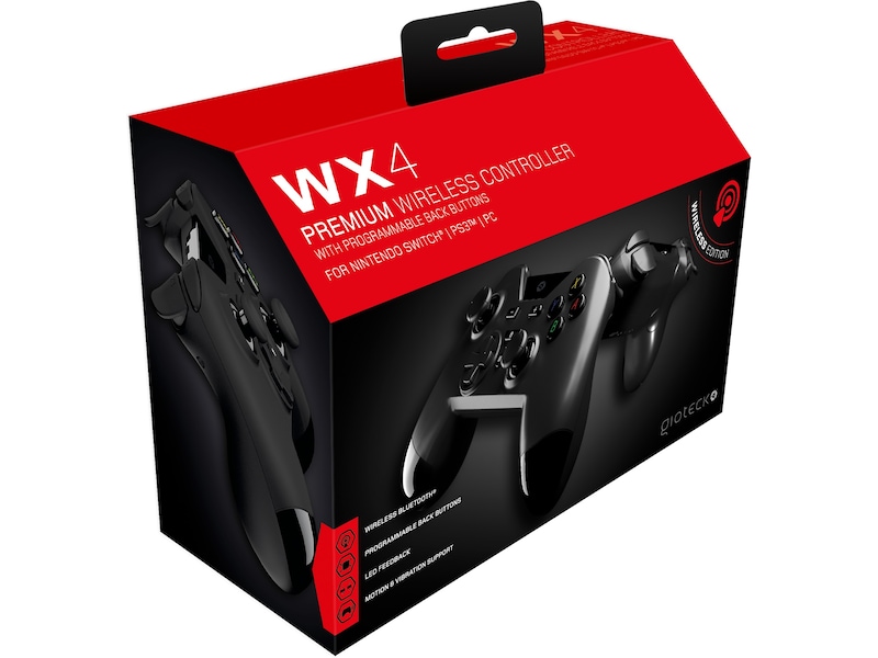 Bliv professionel, og skift Joy-Con™-controllerne ud med WX-4 – den ultimative pro-gaming-kontrol med Switch™. Vores traditionelle design lader dig spille komfortabelt i timevis. Bliv elite og få fordelen med programmerbare tilbageknapper, kortlæg på farten til dine præferencer. Med bevægelses- og vibrationskompatibilitet leverer WX-4 forbløffende, fordybende spil.
