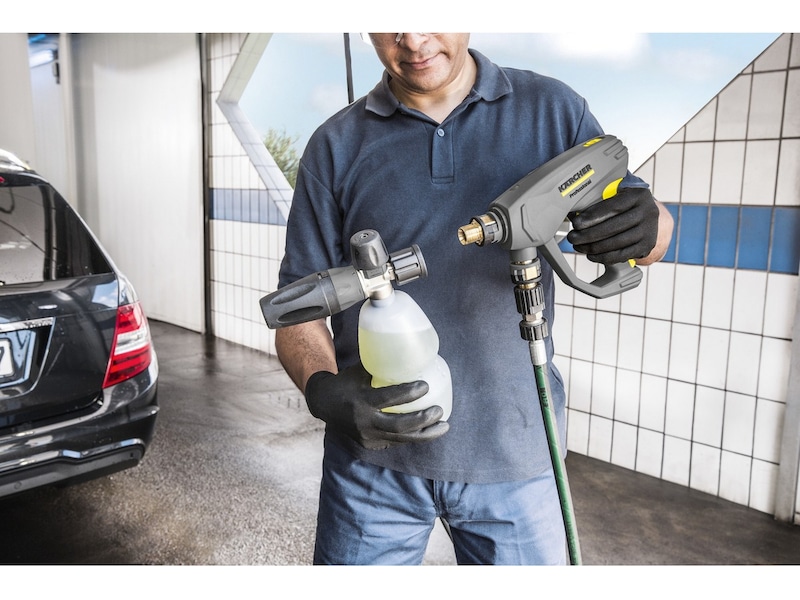 Kort, handy skumlanse med justerbar sprøjtevinkel og en liters tank til rengøringsmiddel.
