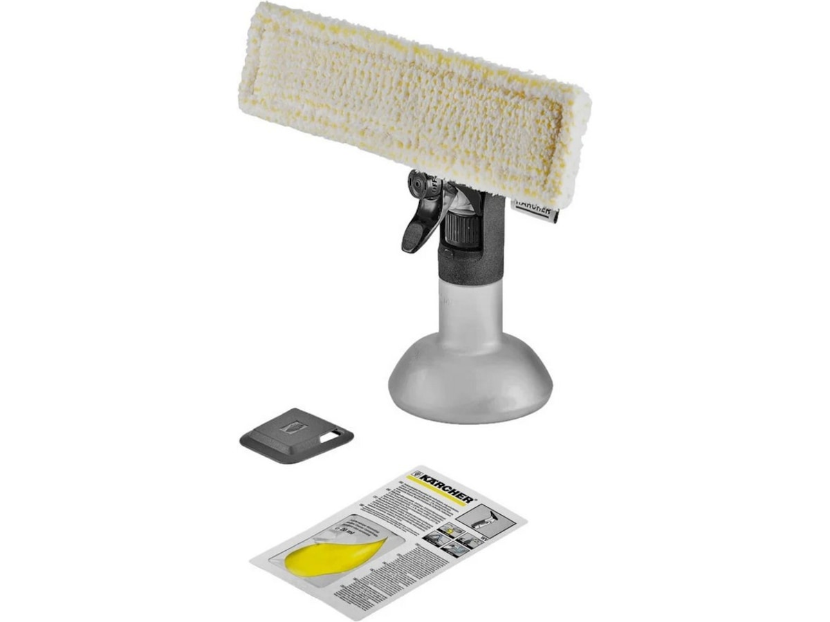 Sprayflaskesættet indeholder en mikrofiberklud med velcro, brede og smalle vinduesskraber (justerbar), grov smudsskraber og 20 ml rengøringskoncentrat.