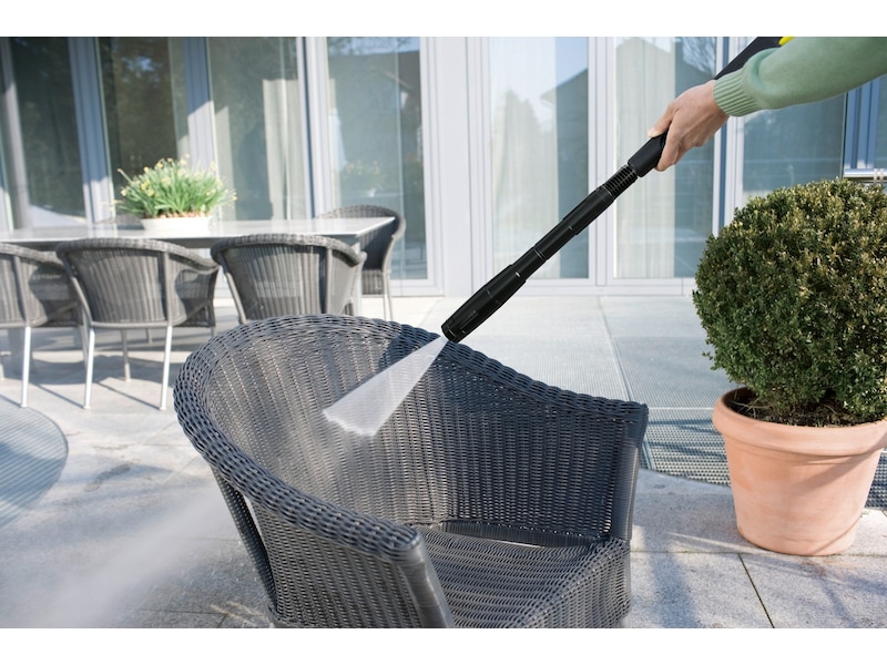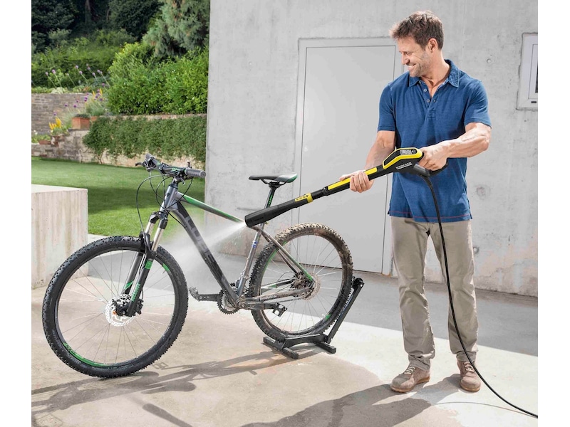 Højtryksrenseren er udstyret med en kraftig vandkølet motor og har aftrækkerpistol med Quick Connect lynkoblingssystem og en 8 meter lang højtryksslange. Der er også en Vario Power sprøjtelanse (VPS), som gør det nemt at indstille det ønskede tryk og som giver skånsom behandling af sarte overflader, foruden et sprøjterør med kraftig roterende stråle til at tackle det mest genstridige snavs. Det integrerede vandfilter beskytter pumpen.
