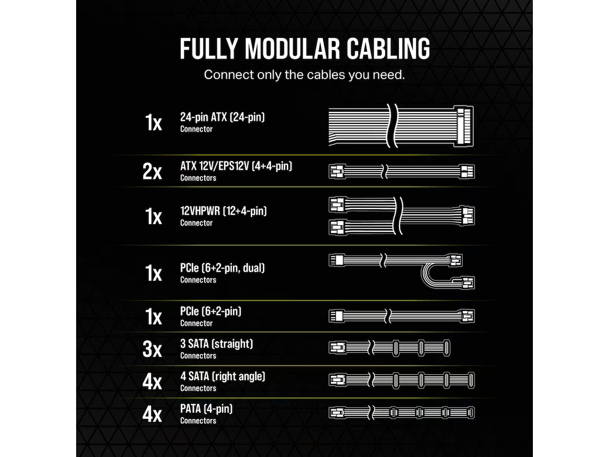 Hold kabelrodet nede ved kun at tilslutte de kabler, dit system har brug for, og intet andet. Fem universelle 8-bens stik kan bruges med ethvert 8-benet kabel, der opfylder alle strømbehovene for moderne bundkort og GPU'er.