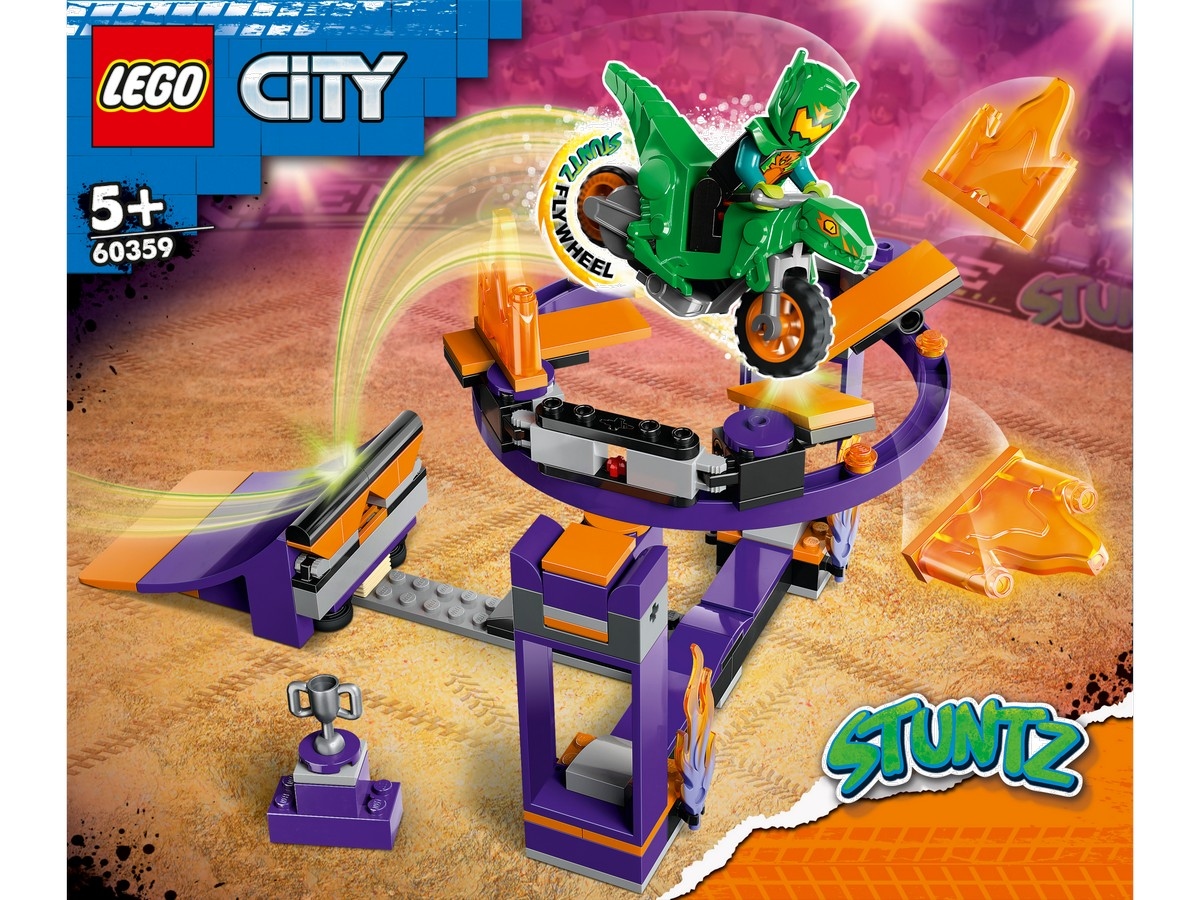 - Hvad er der i æsken? – Dette byggelegetøj indeholder en LEGO® City Stuntz-ring med vandret eller lodret indstilling, startrampe, svinghjulsdrevet stuntmotorcykel og en minifigur af en kører