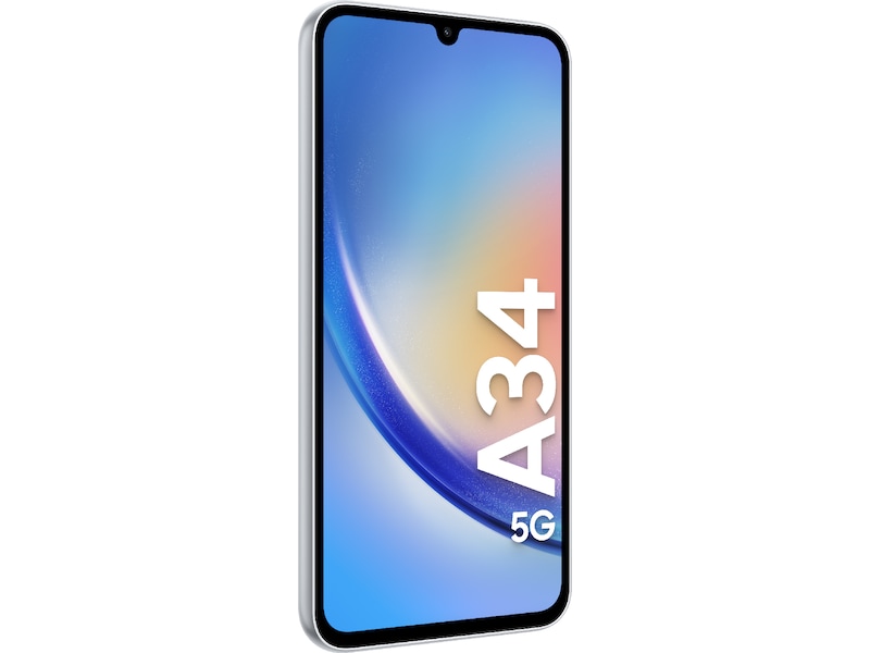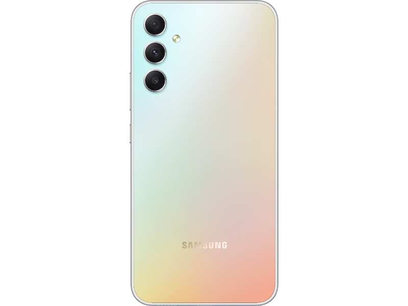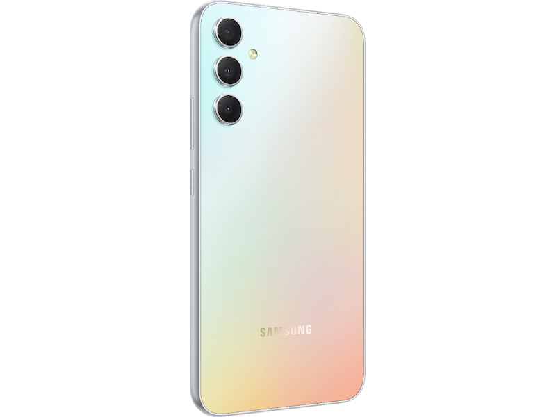 Galaxy A34 5G har rene linjer og en finish i klart glas. Den fås i de tidløse farver Awesome Lime, Awesome Silver, Awesome Violet og Awesome Graphite.