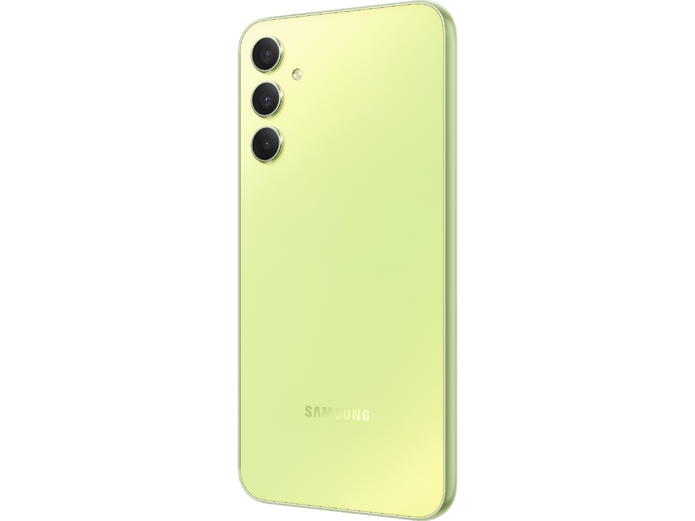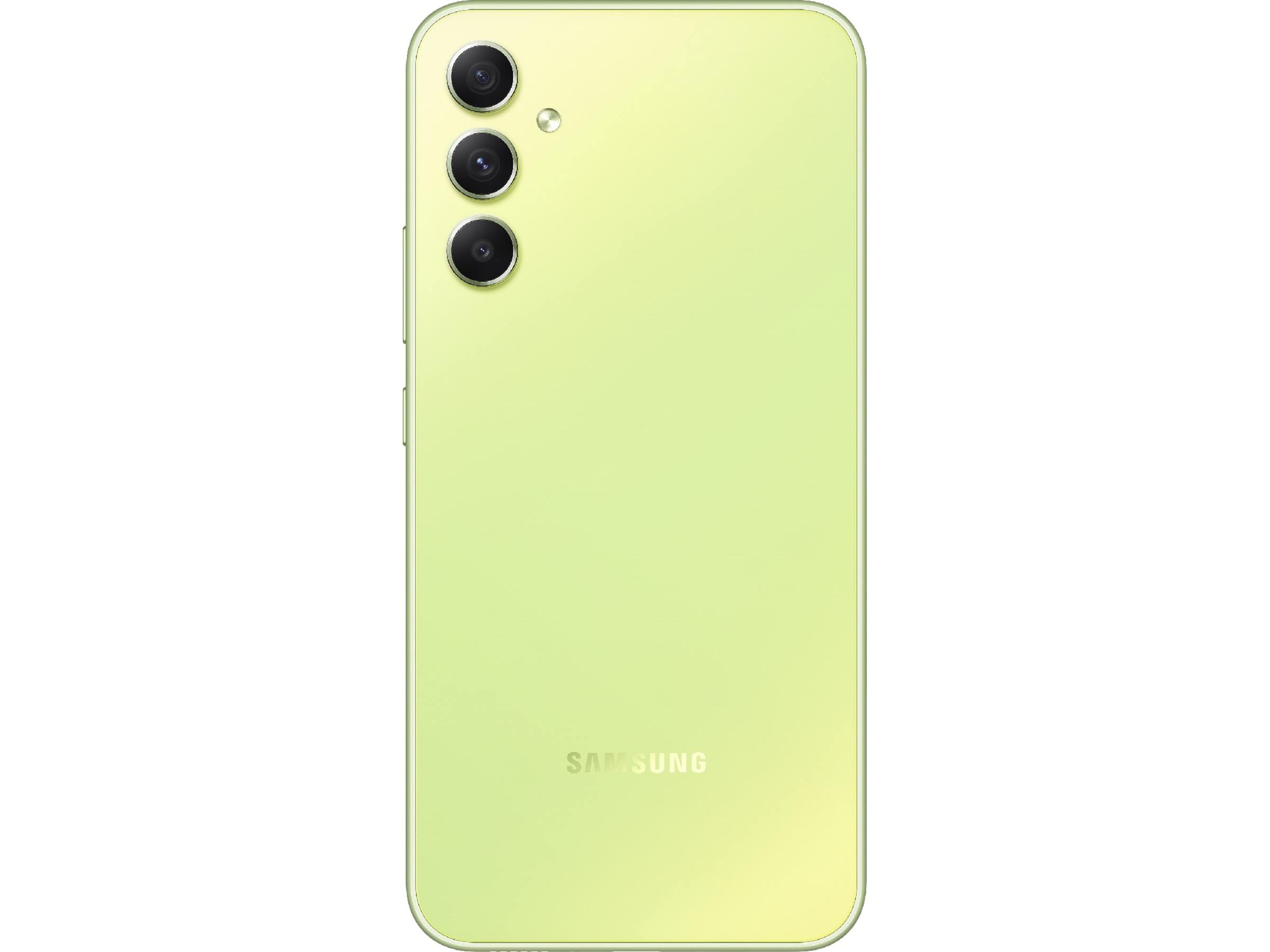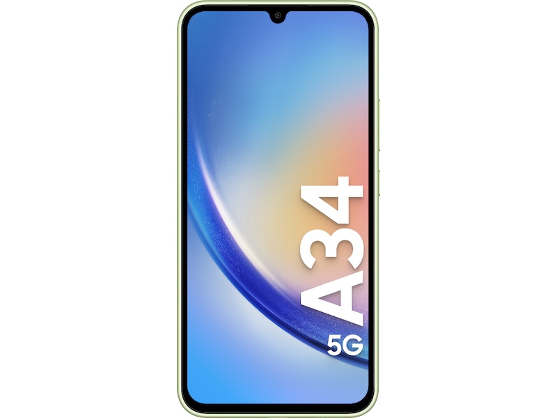 Galaxy A34 5G har rene linjer og en finish i klart glas. Den fås i de tidløse farver Awesome Lime, Awesome Silver, Awesome Violet og Awesome Graphite.